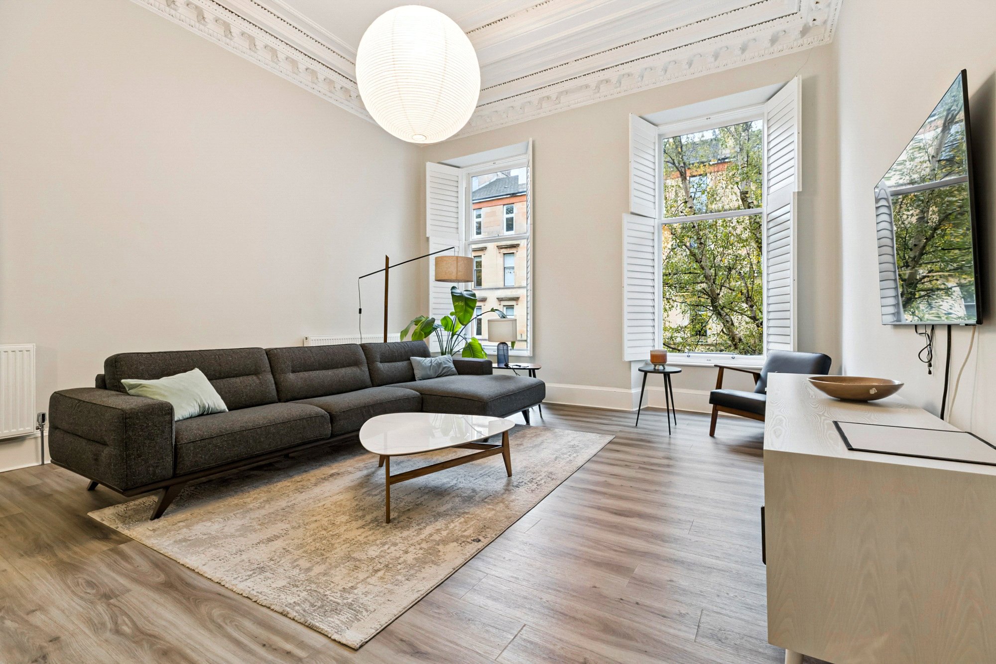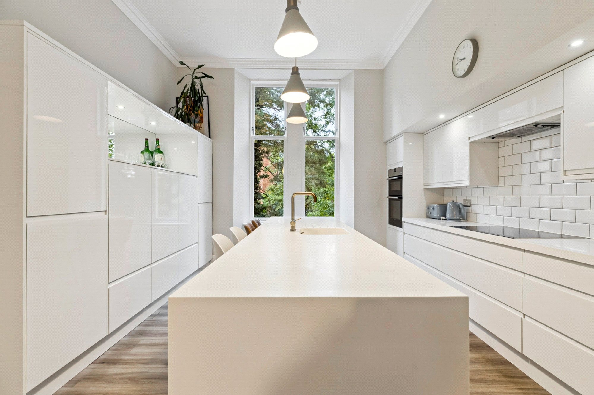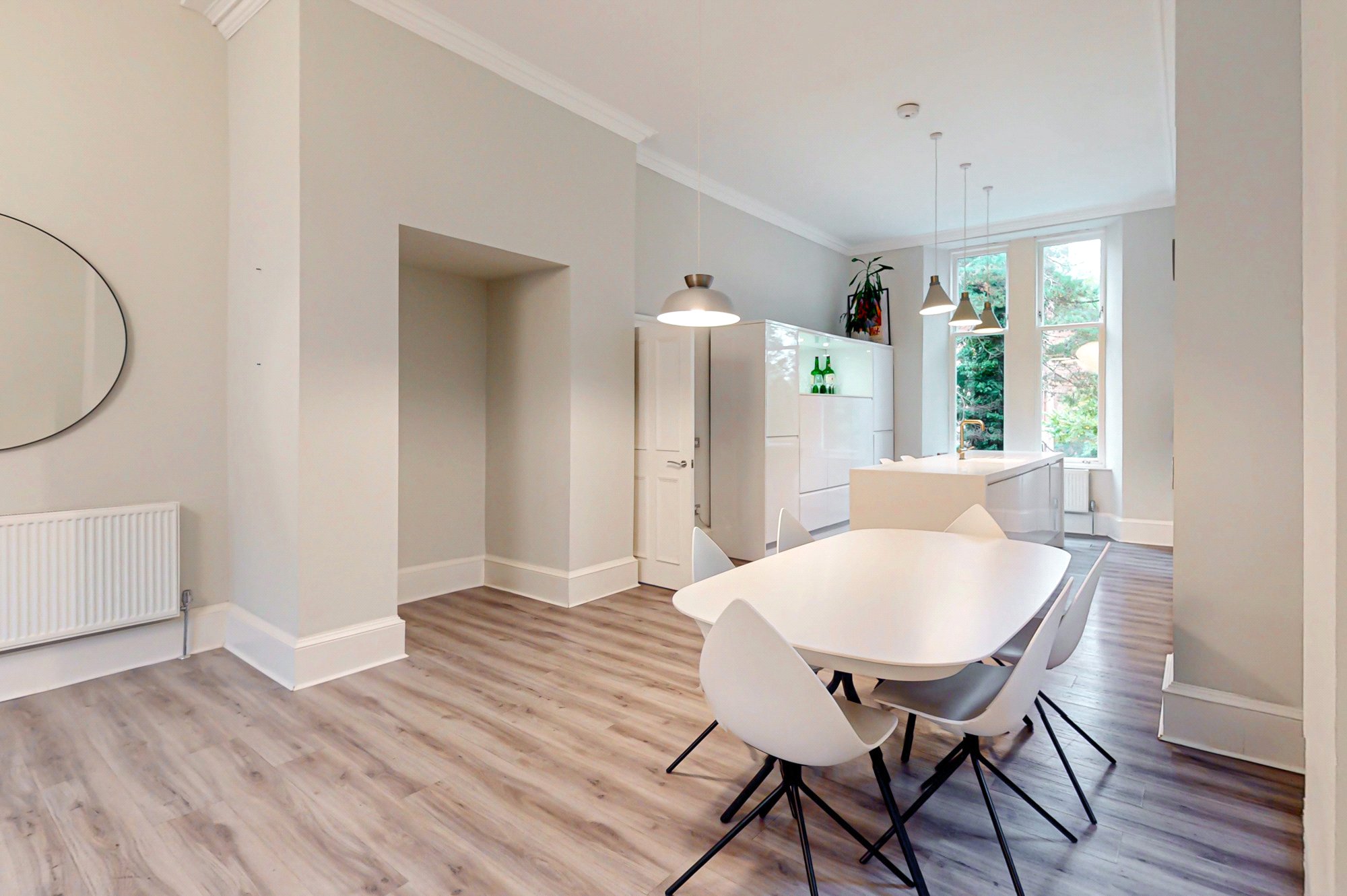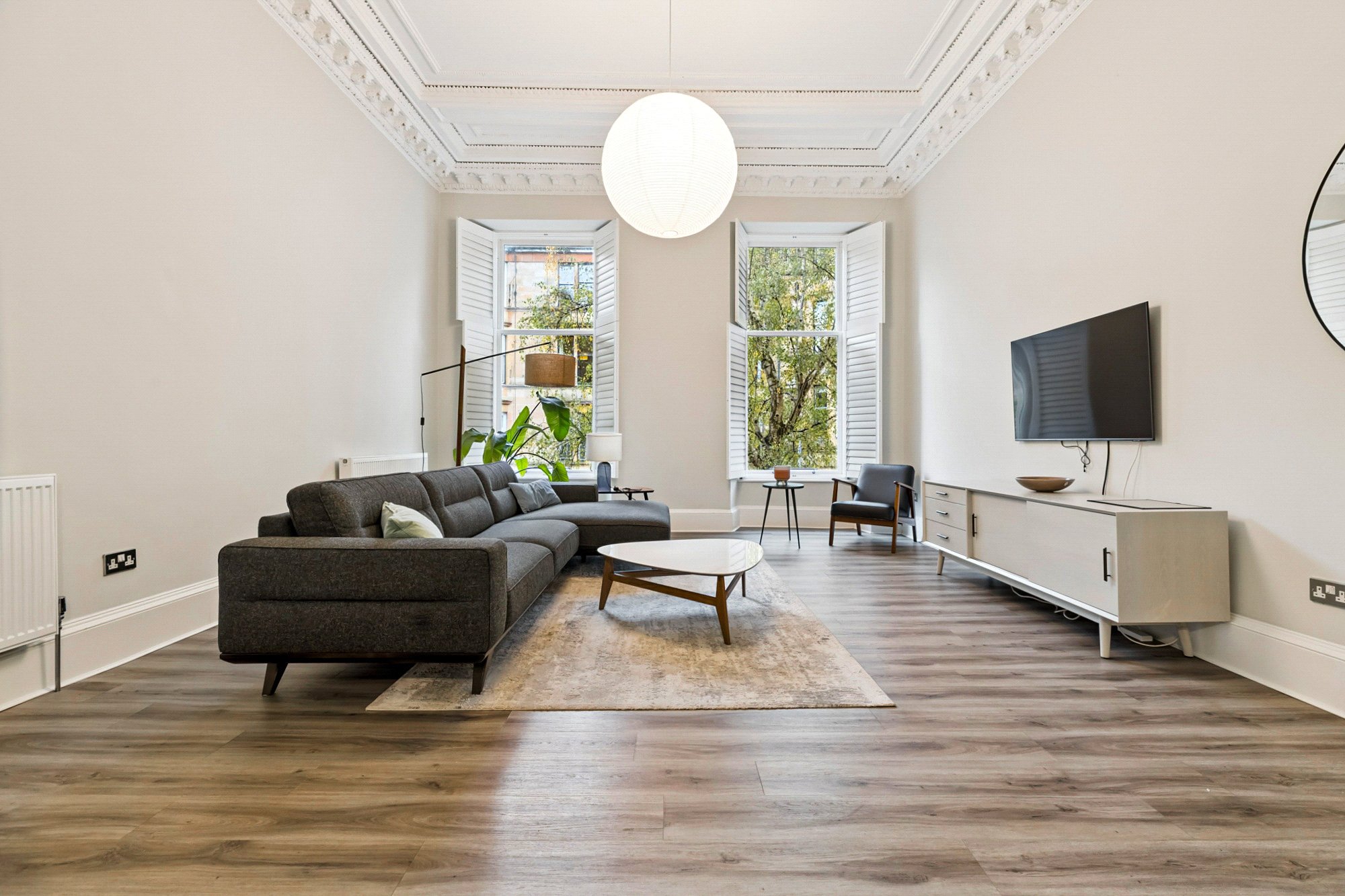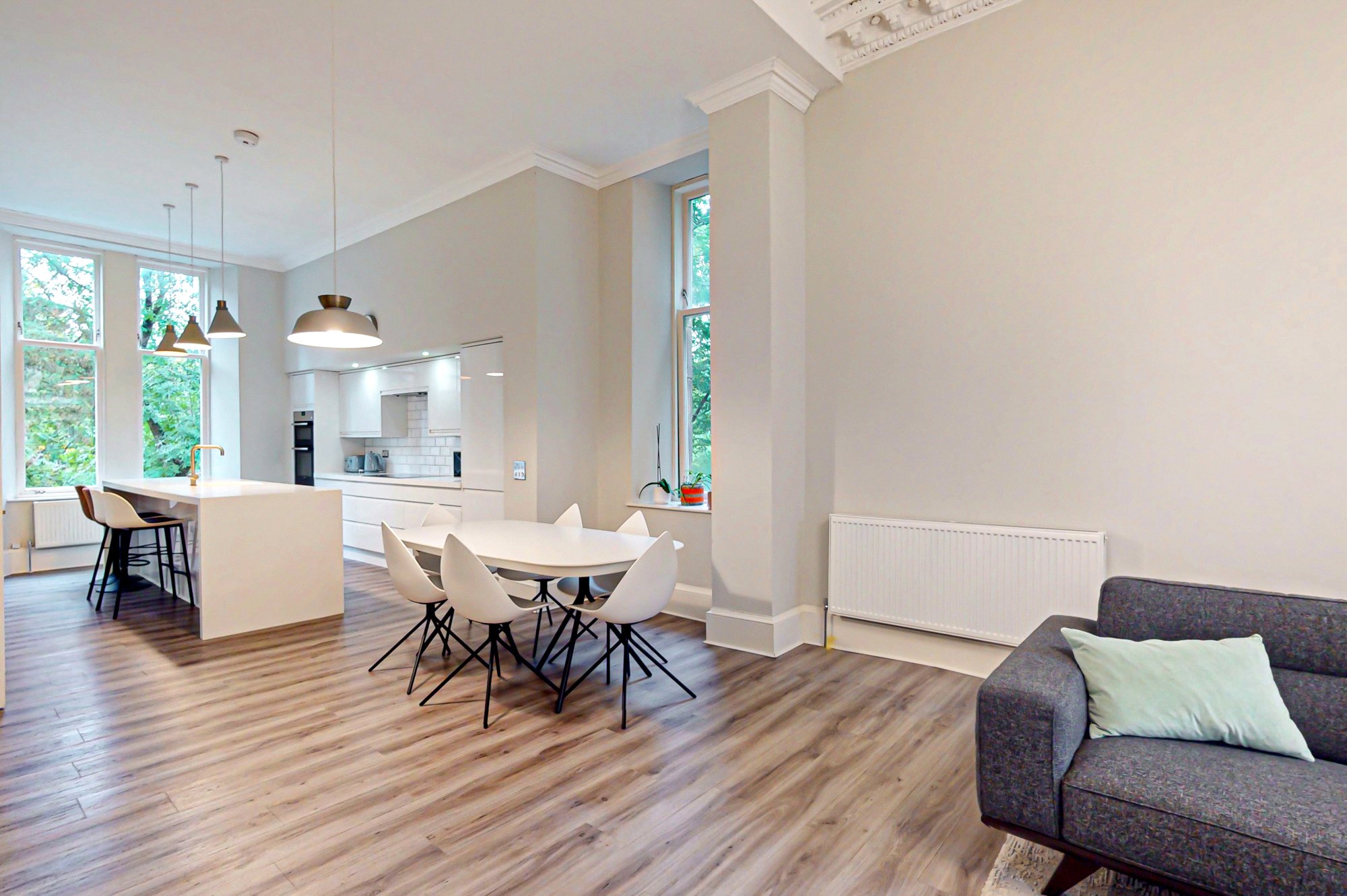 Forming part of a handsome blonde sandstone building on Clouston Street, this immediately impressive and spacious three-bedroom first floor flat is completed to an exceptional standard throughout and offers a contemporary level of finish throughout. The accommodation benefits from excellent natural light, has a comfortable feel and includes a welcoming reception hallway, a magnificent living room through dining kitchen with focal point ‘Corian’ topped island, three excellent double bedrooms and a bathroom comprising ‘Porcelanosa’ three-piece suite.