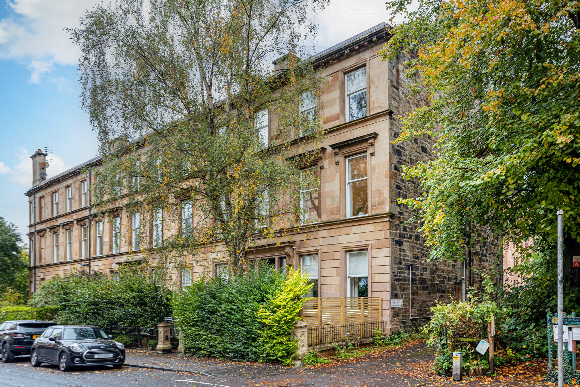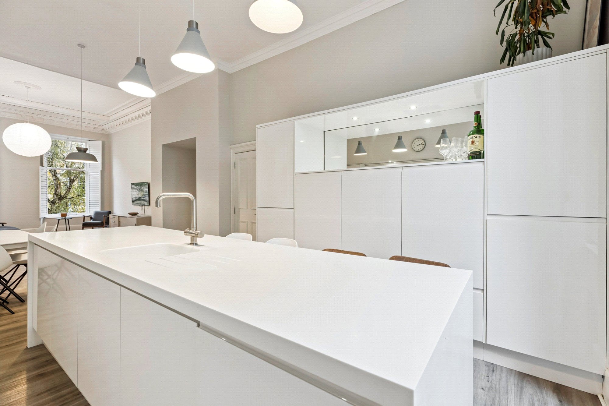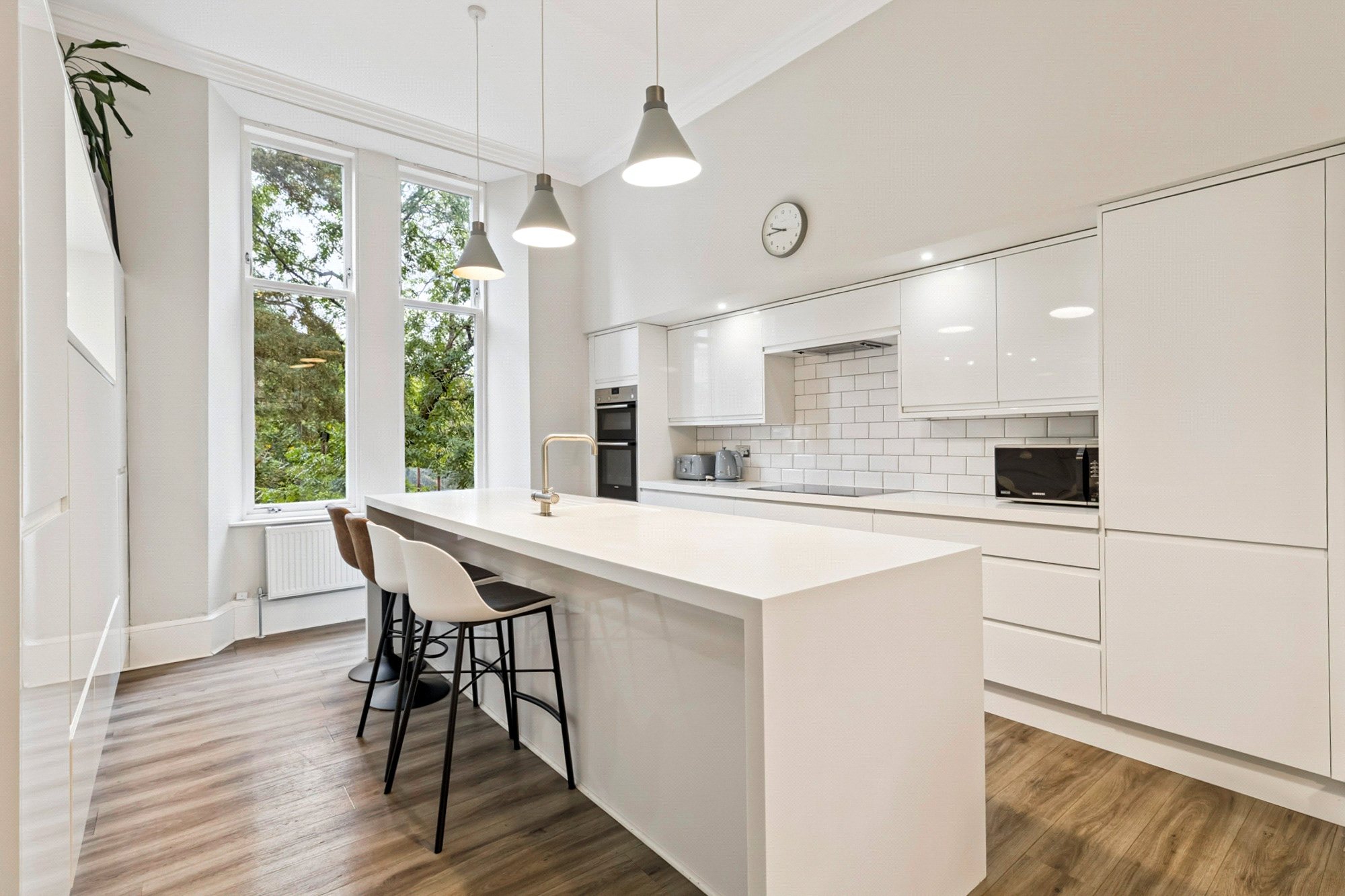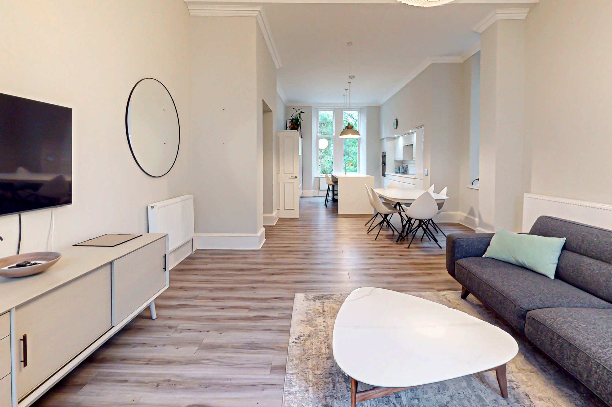 Forming part of a handsome blonde sandstone building on Clouston Street, this immediately impressive and spacious three-bedroom first floor flat is completed to an exceptional standard throughout and offers a contemporary level of finish throughout. The accommodation benefits from excellent natural light, has a comfortable feel and includes a welcoming reception hallway, a magnificent living room through dining kitchen with focal point ‘Corian’ topped island, three excellent double bedrooms and a bathroom comprising ‘Porcelanosa’ three-piece suite.