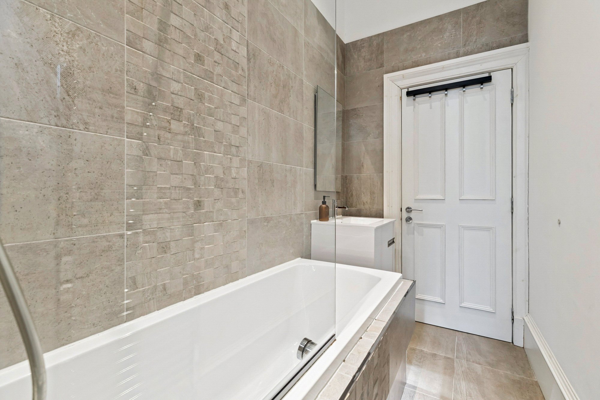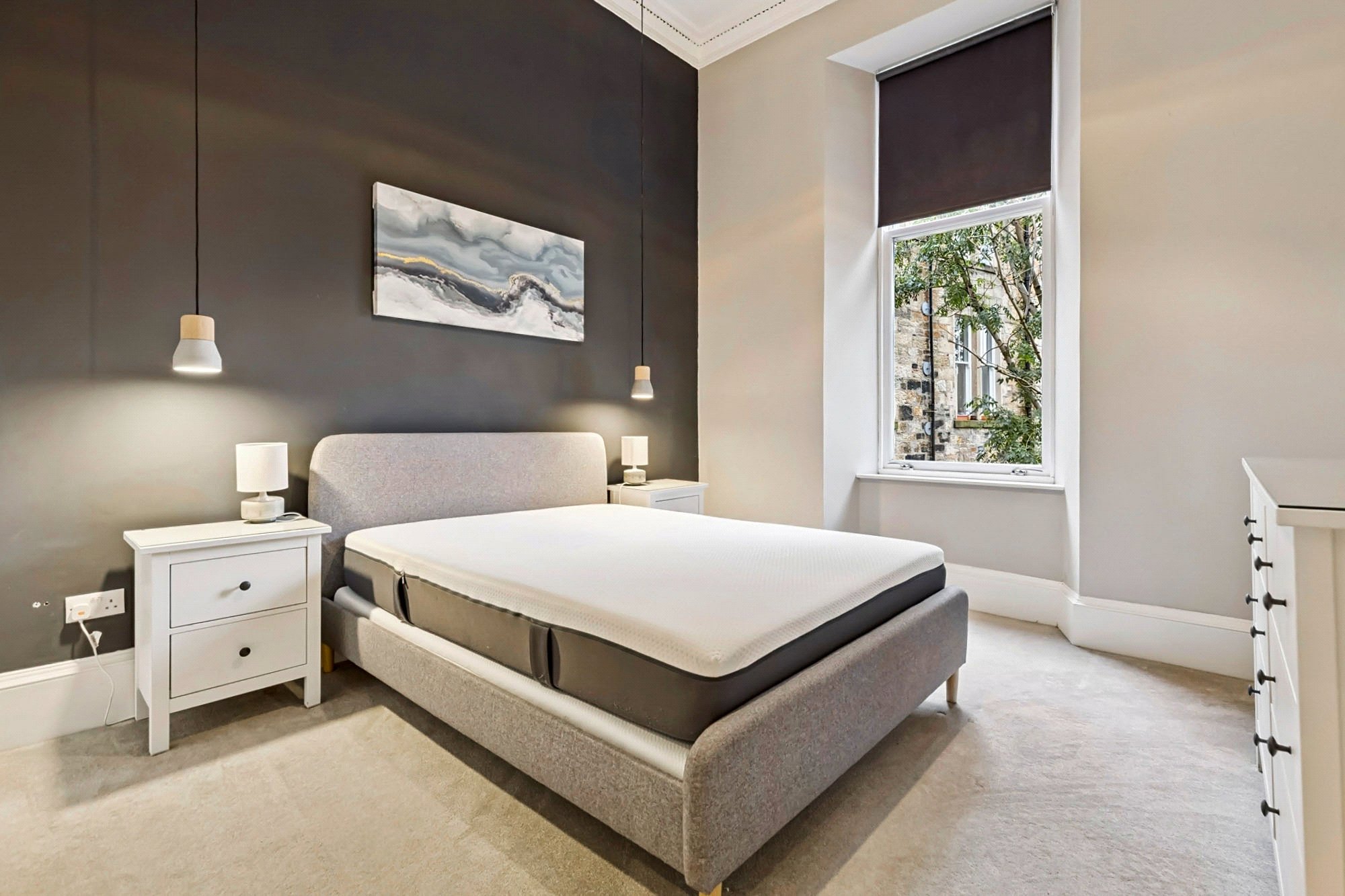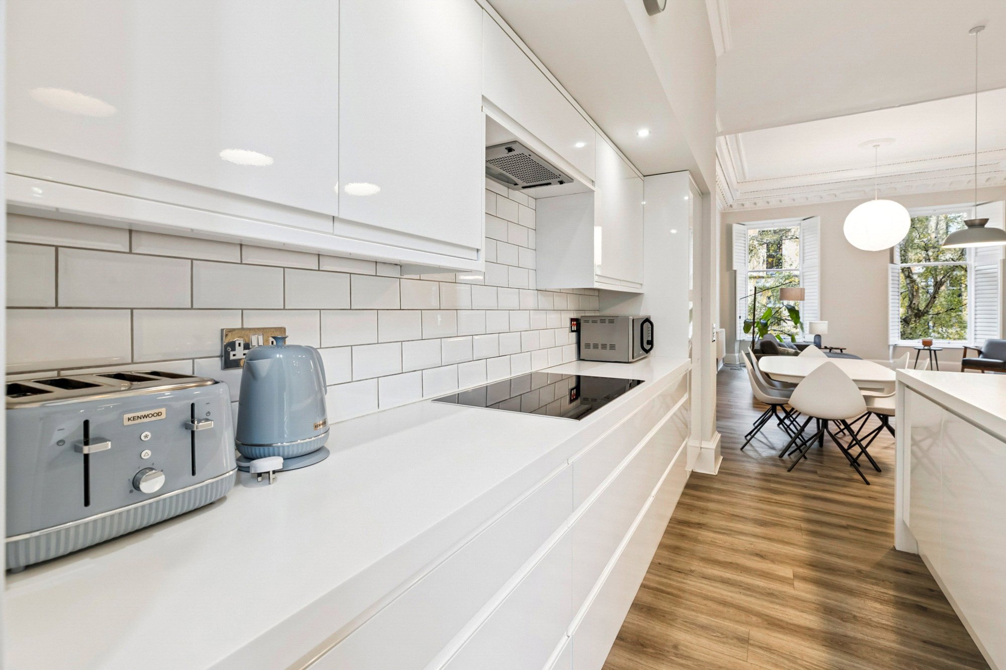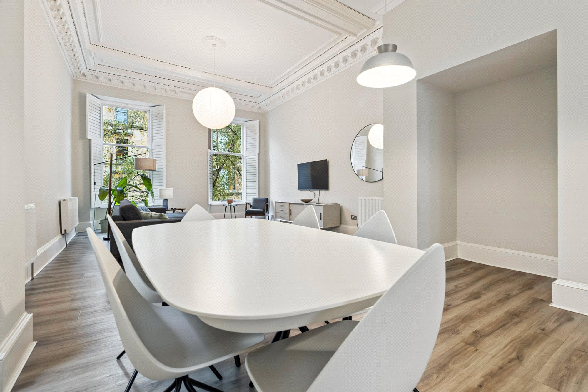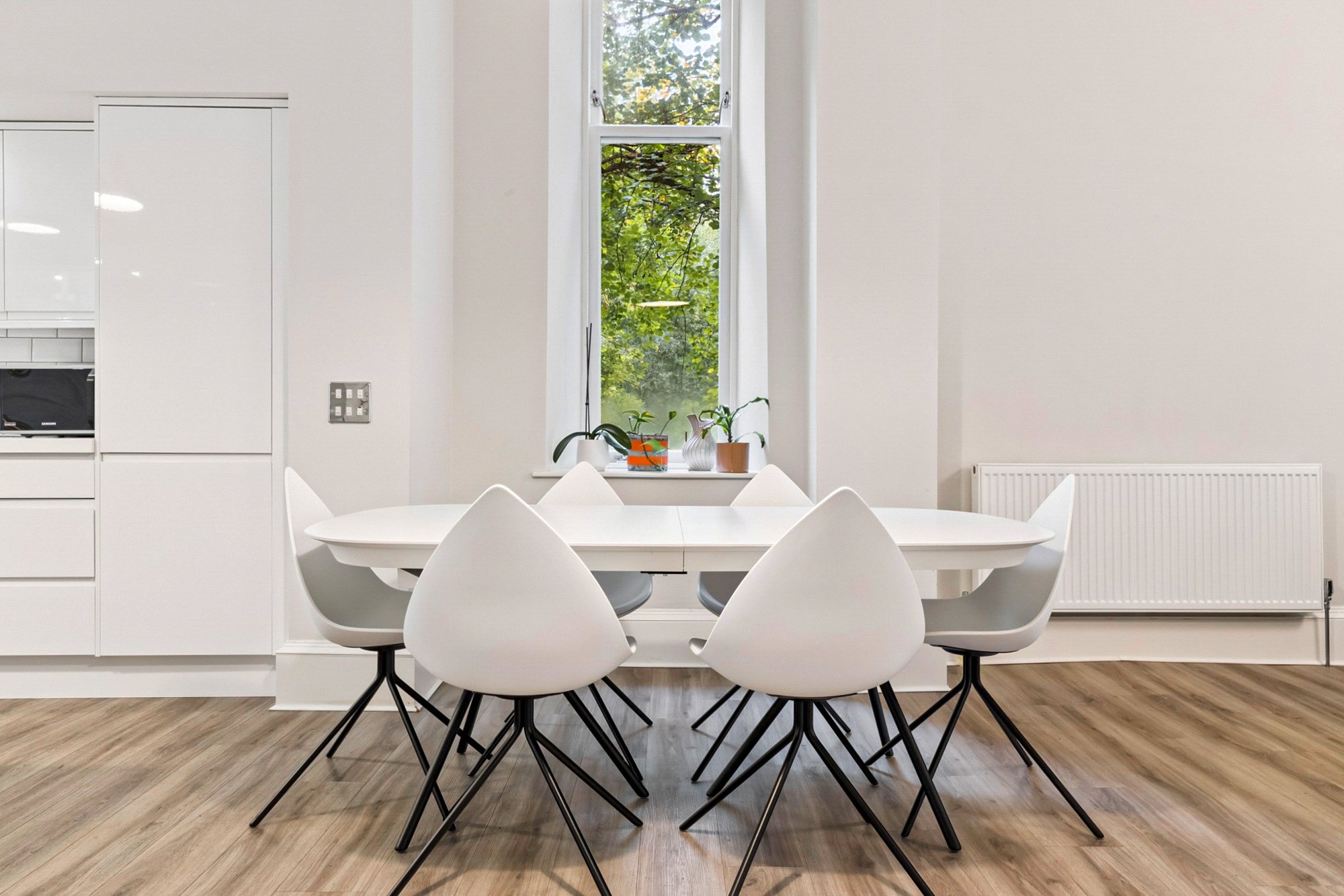 Forming part of a handsome blonde sandstone building on Clouston Street, this immediately impressive and spacious three-bedroom first floor flat is completed to an exceptional standard throughout and offers a contemporary level of finish throughout. The accommodation benefits from excellent natural light, has a comfortable feel and includes a welcoming reception hallway, a magnificent living room through dining kitchen with focal point ‘Corian’ topped island, three excellent double bedrooms and a bathroom comprising ‘Porcelanosa’ three-piece suite.
