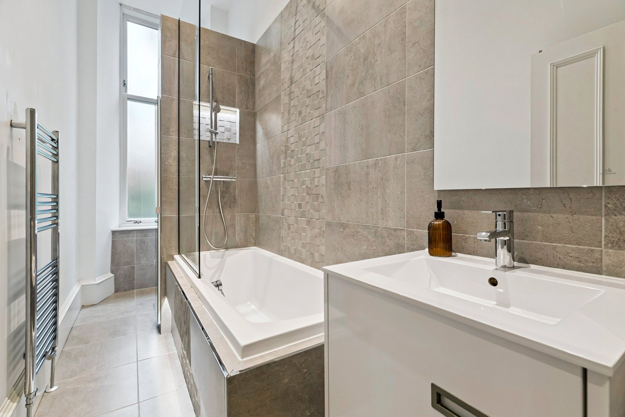 - Stylish three-piece bathroom comprising bath, over bath shower, toilet and was hand basin. Window to the rear