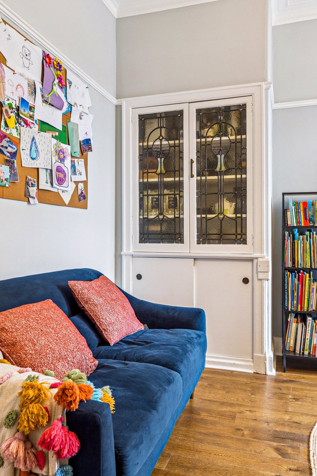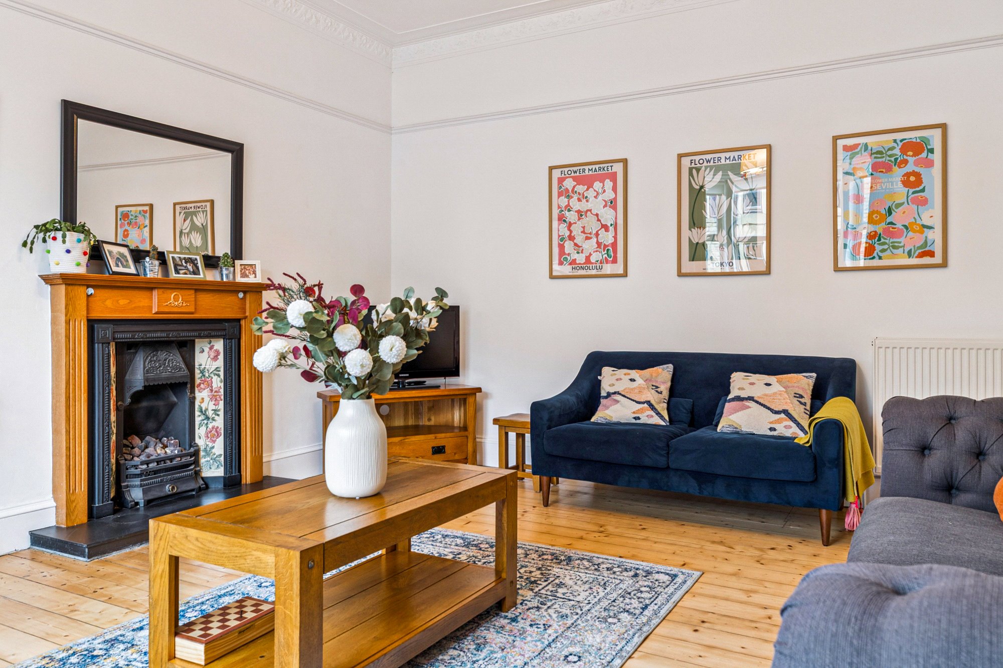 - Beautiful front lounge with traditional wooden floors, broad bay window, original cornice, gorgeous stained glass motifs and floral tiled focal gas fireplace.
