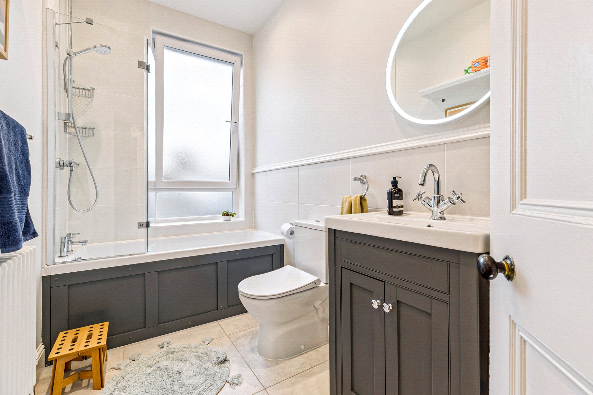 - Three piece family bathroom with shower over bath, window to the rear, illuminated mirror, and traditional sanitary fittings.