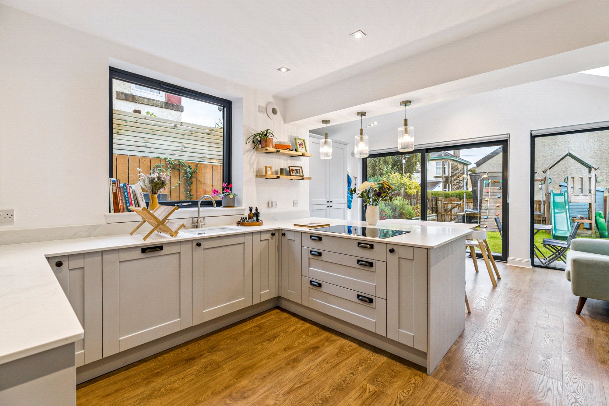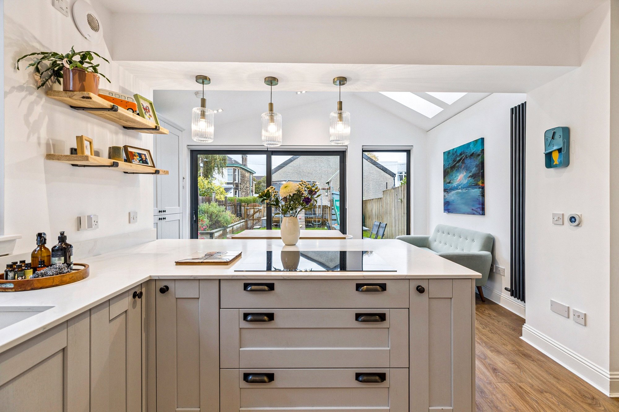 - Fantastic bespoke fitted kitchen, open to a gorgeous dining-room extension with a full wall of glazing and three Velux roof windows that drench the space in light. Sleek square inset cabinetry provides excellent storage, with solid surface worktops, pendant lighting above a breakfast island, and sliding doors opening to the garden.