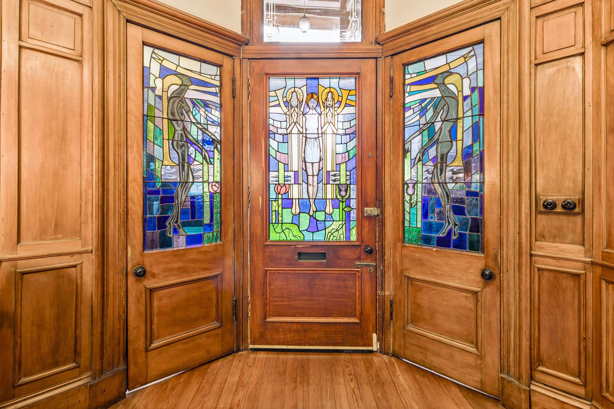 Visitors are initially greeted by a distinguished baroque entranceway, which then gives way to a stupendous hallway crowned by an utterly sublime Art Nouveau stained-glass triptych. The stunning angelic central motif figure is echoed by personified side windows, with their flowing lines and jewel tones paying homage to the era’s fondness for Romanticism. These beautiful stained-glass finishes were designed and installed by the present owners. Beyond, the plethora of gorgeous embellishments and traditional features only continues, establishing this substantial home as a synthesis of period grandeur and comfort.