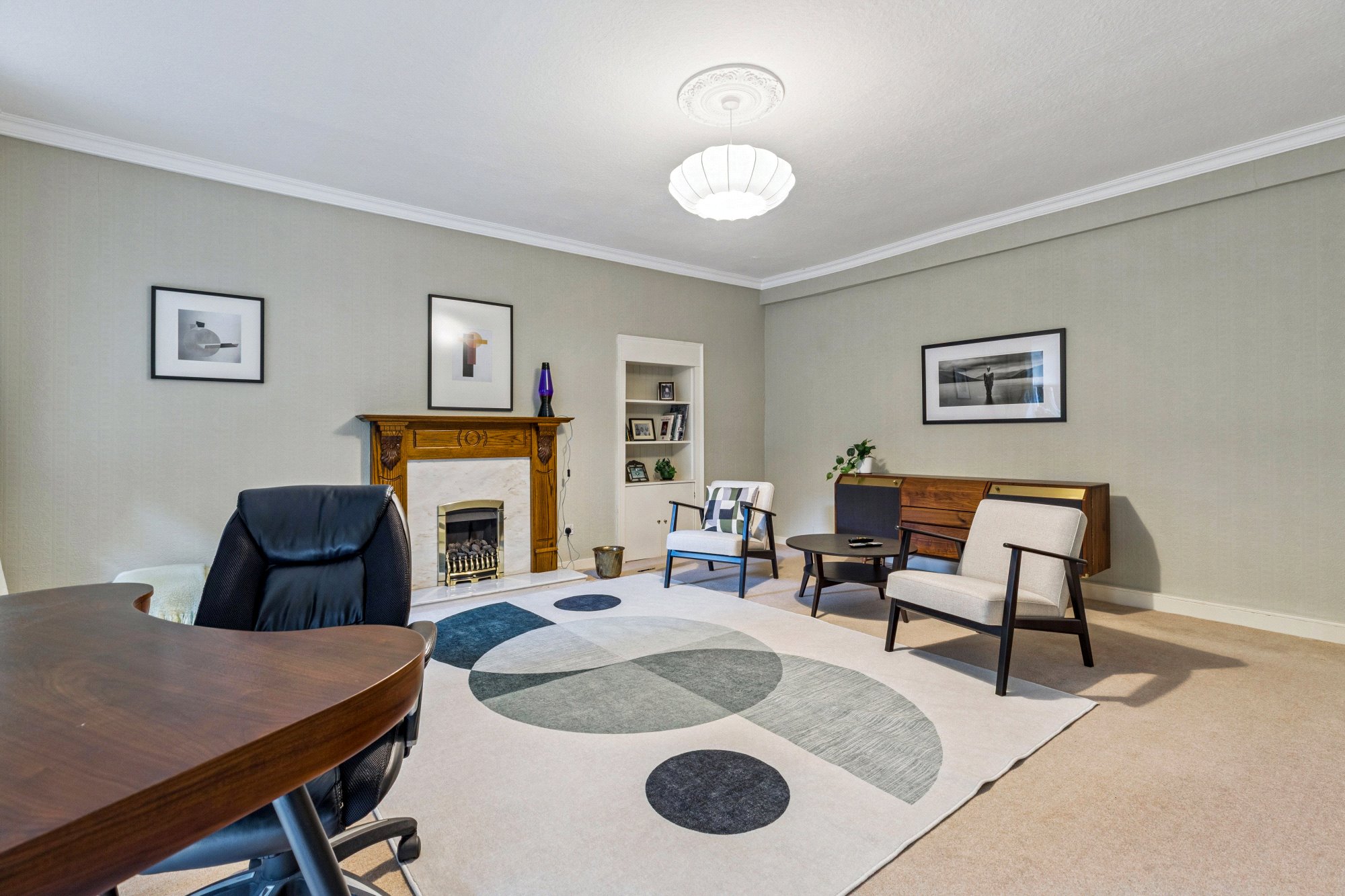- Large office/den with focal fireplace, ornate cornice, triple section window to the rear and integrated shelving.