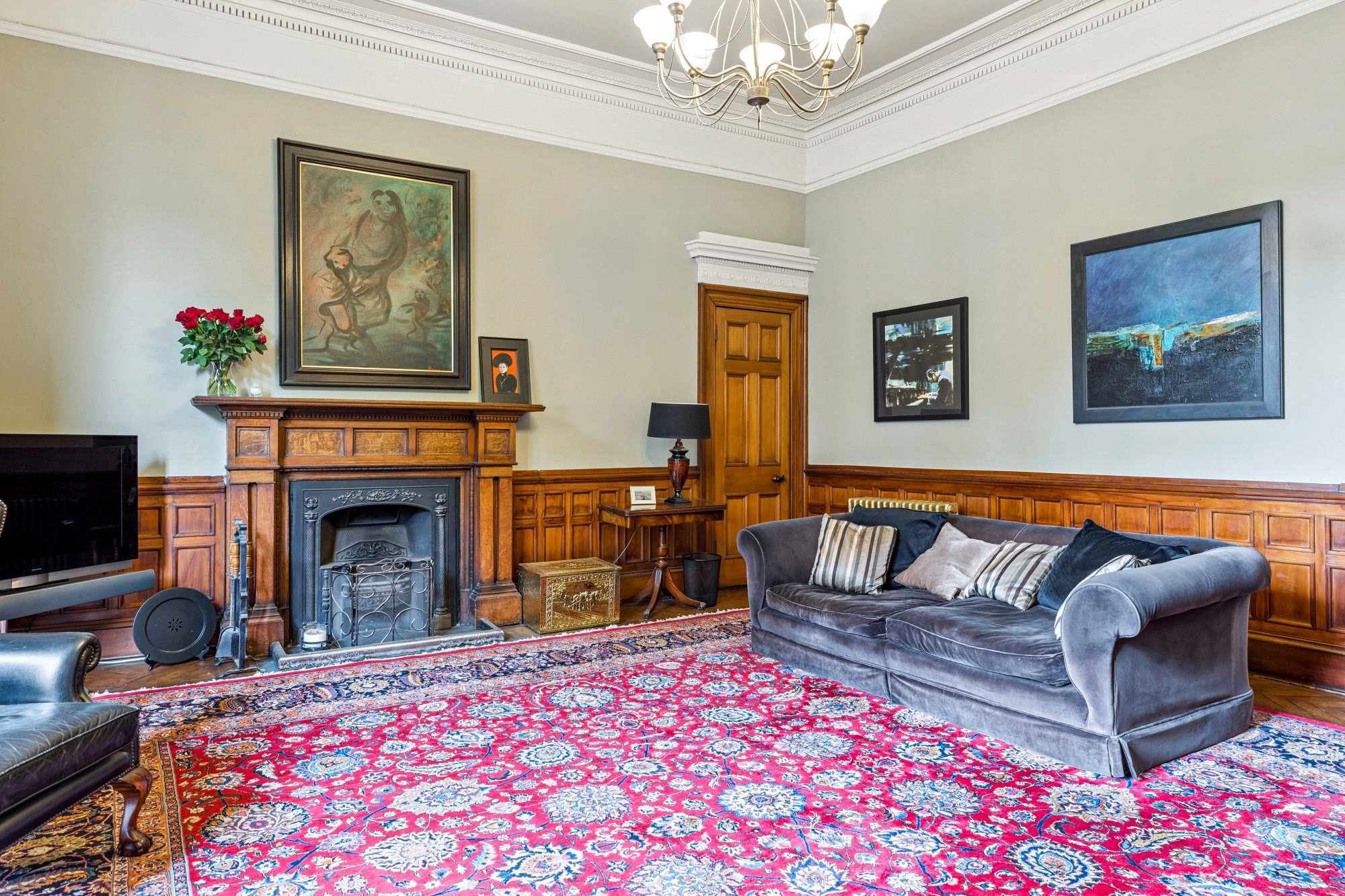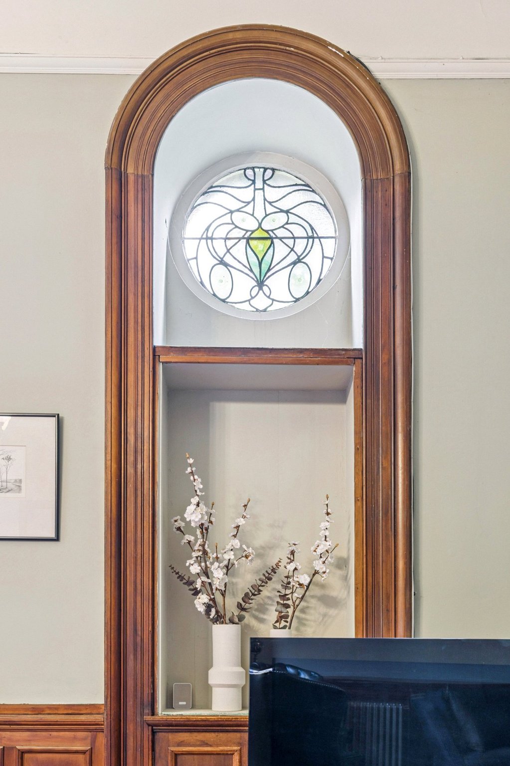 - Front drawing room with refined timber panelling, original herringbone parquet flooring, focal fireplace, ornate cornice and spectacular south facing bow window complimented by an elegant Art Nouveau leaded-glass ocular side window.