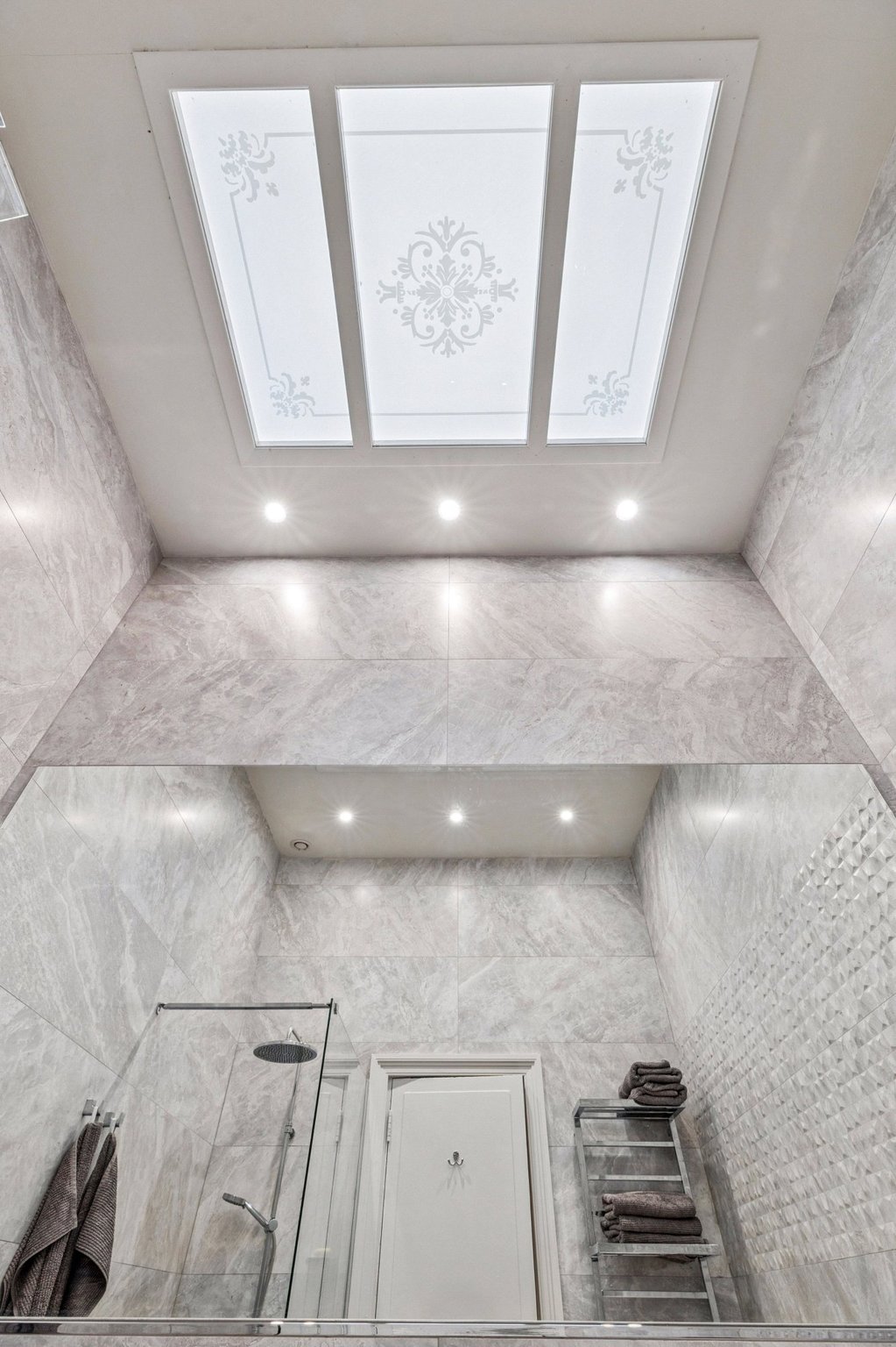 - Stairway from hallway graced by traditional balustrade, large skylight, and leading to the upper landing.