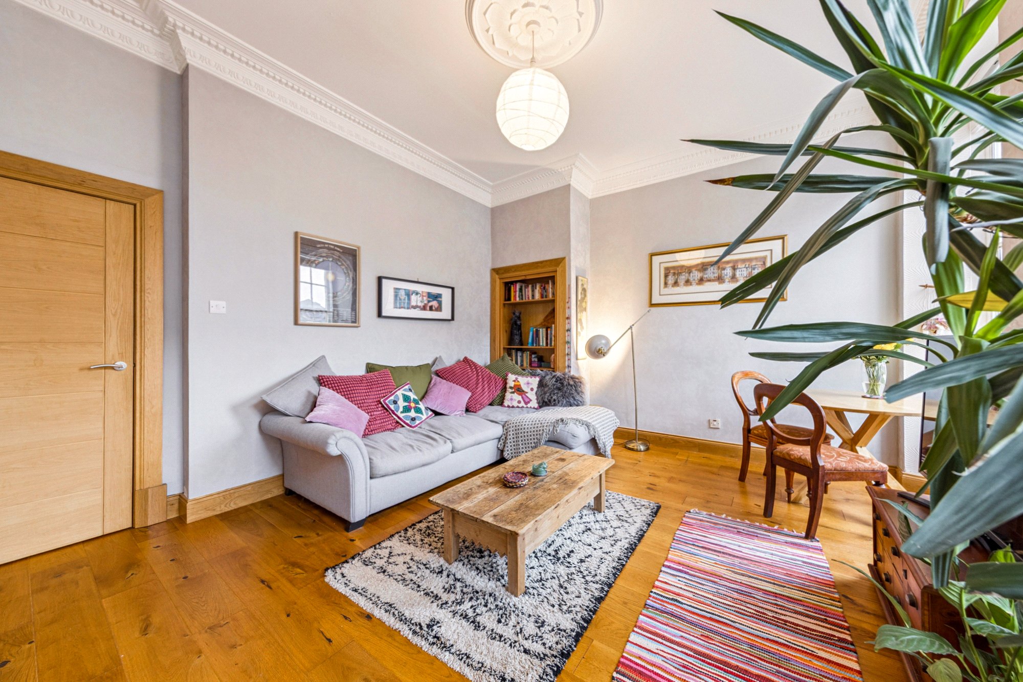 The apartment forms part of the distinctive curved “gushet” tenement on the corner of Argyle Street and Minerva Street; a handsome landmark within Finnieston’s historic streetscape. Dating from around 1856 and thought to have been formerly known as Napier Place, the building is immediately striking thanks to its imposing classical facade, arched openings at street level and grand Corinthian pilasters that emphasise the buildings presence and complement the gentle sweep of Minerva Street.