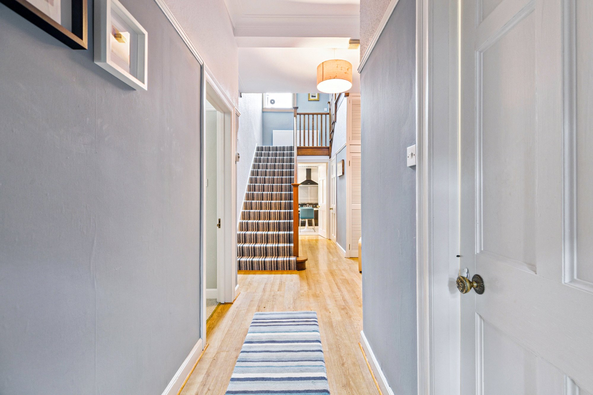 - Broad stairway leading to the three quarter and upper landings with a beautiful, restored wooden banister.