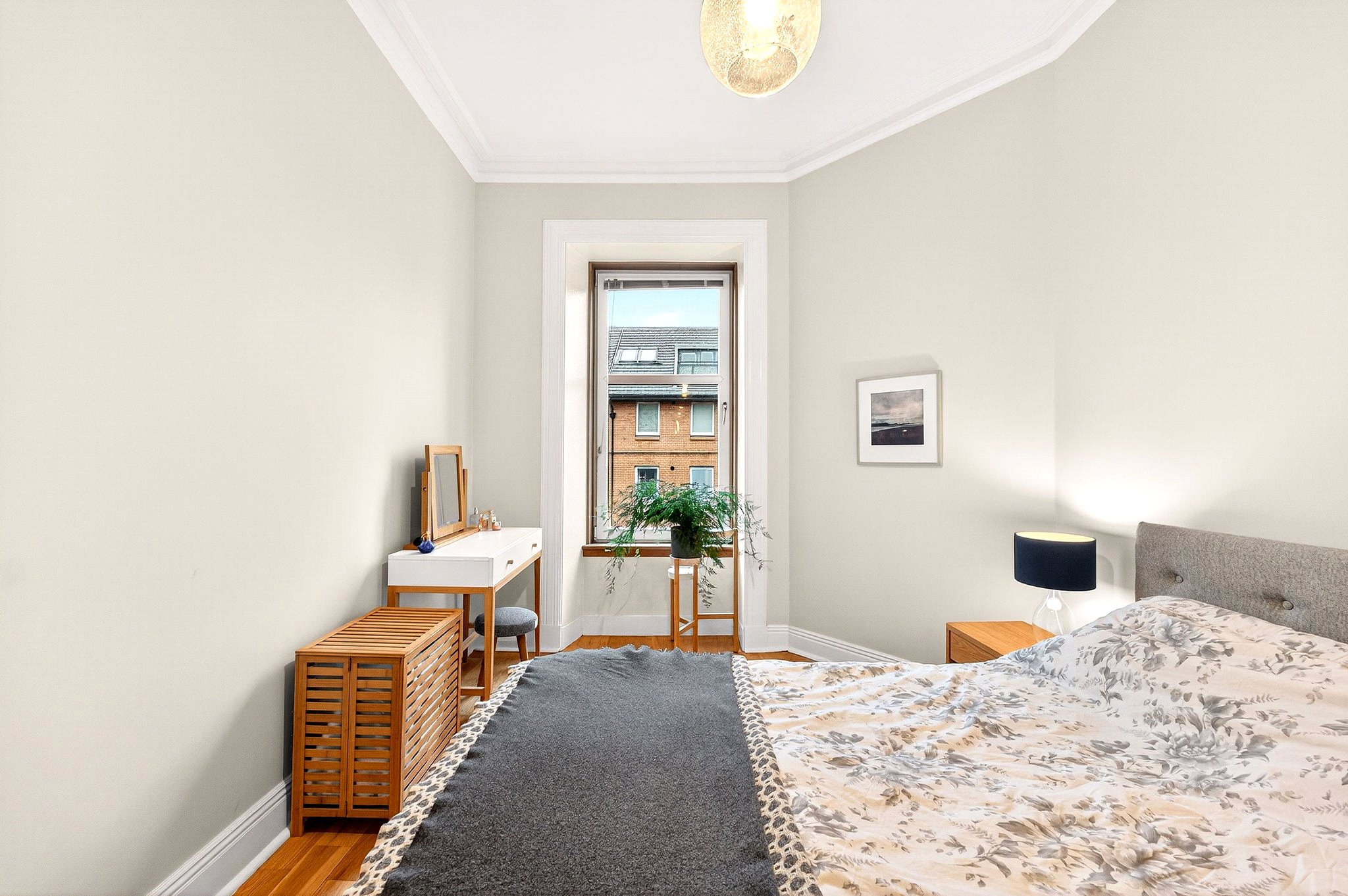 The interior of the property has been upgraded to a superb standard throughout and it is plain to see that the current owners take great pride in the presentation of the apartment. As such, the accommodation is bright, beautifully decorated and ready to be moved into and enjoyed immediately. In brief the accommodation extends to; broad entrance hall which provides access to each of the principal apartments, substantial front-facing bay window living room which can comfortably accommodate a sitting area and a dining table and chairs. The full-sized kitchen with recess area has been upgraded to an impressive specification and features white high gloss cabinetry, integrated appliances and has a pleasant outlook over the tree-filled rear garden spaces behind the tenement. There are two comfortable bedrooms of which the principal is of particularly good proportions, offering lots of space for a king-sized bed and free-standing twin wardrobe. The second is a comfortable double which is currently utilised as a multi-use space that switches between double bedroom, home office and dressing room. The shower room is presented at a superb standard with stylish contemporary tiling and an attractive three-piece suite.