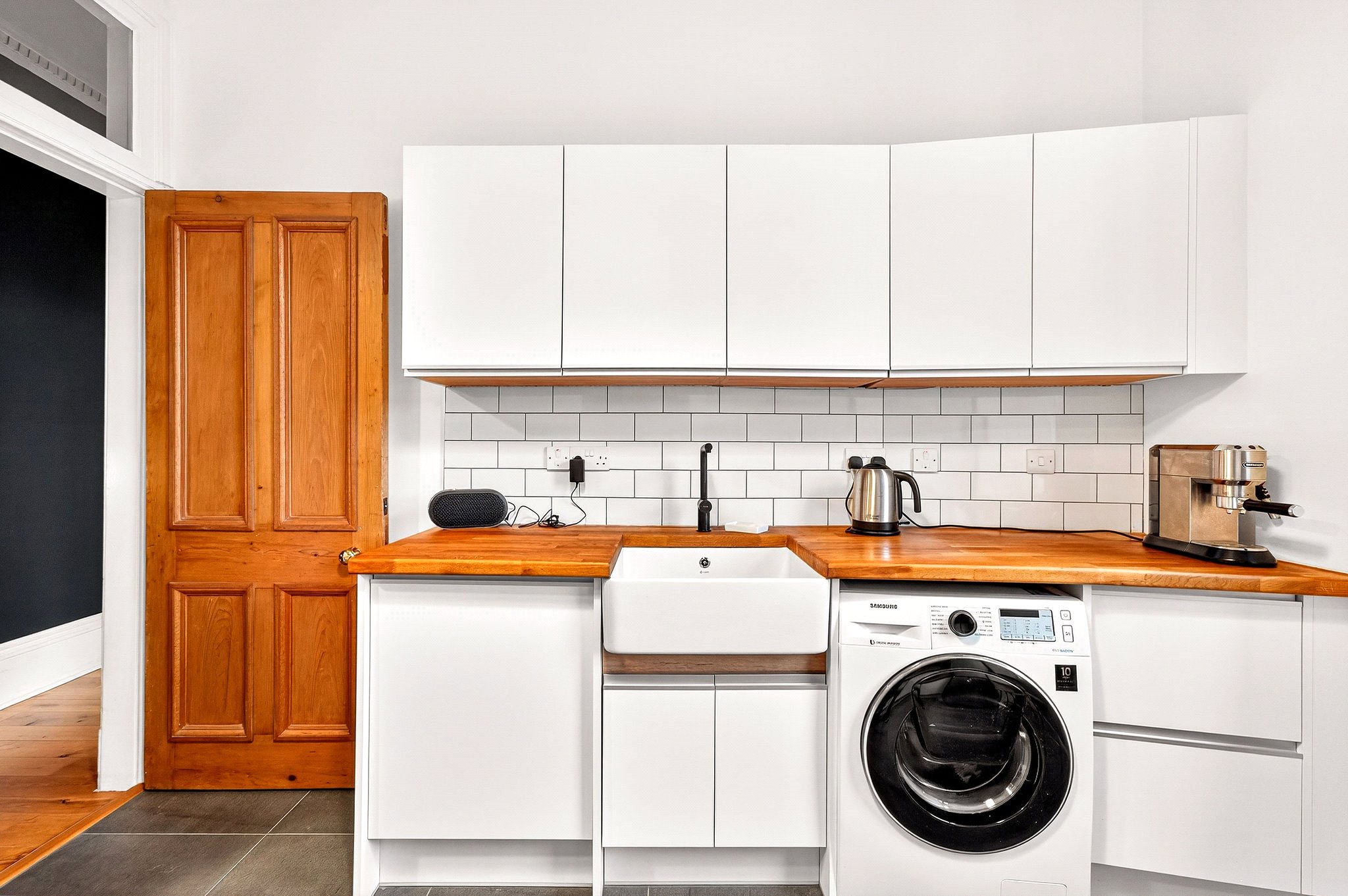 • Upgraded kitchen with white high-gloss units, integrated appliances and rear outlook