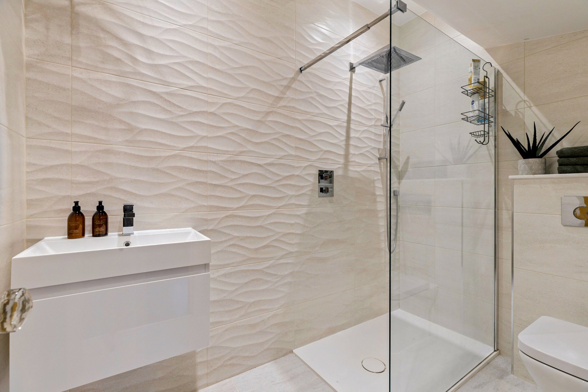 - Outstanding family shower room with window to the rear, a three-piece white suite including a large walk-in shower cubicle and stylish tiling.