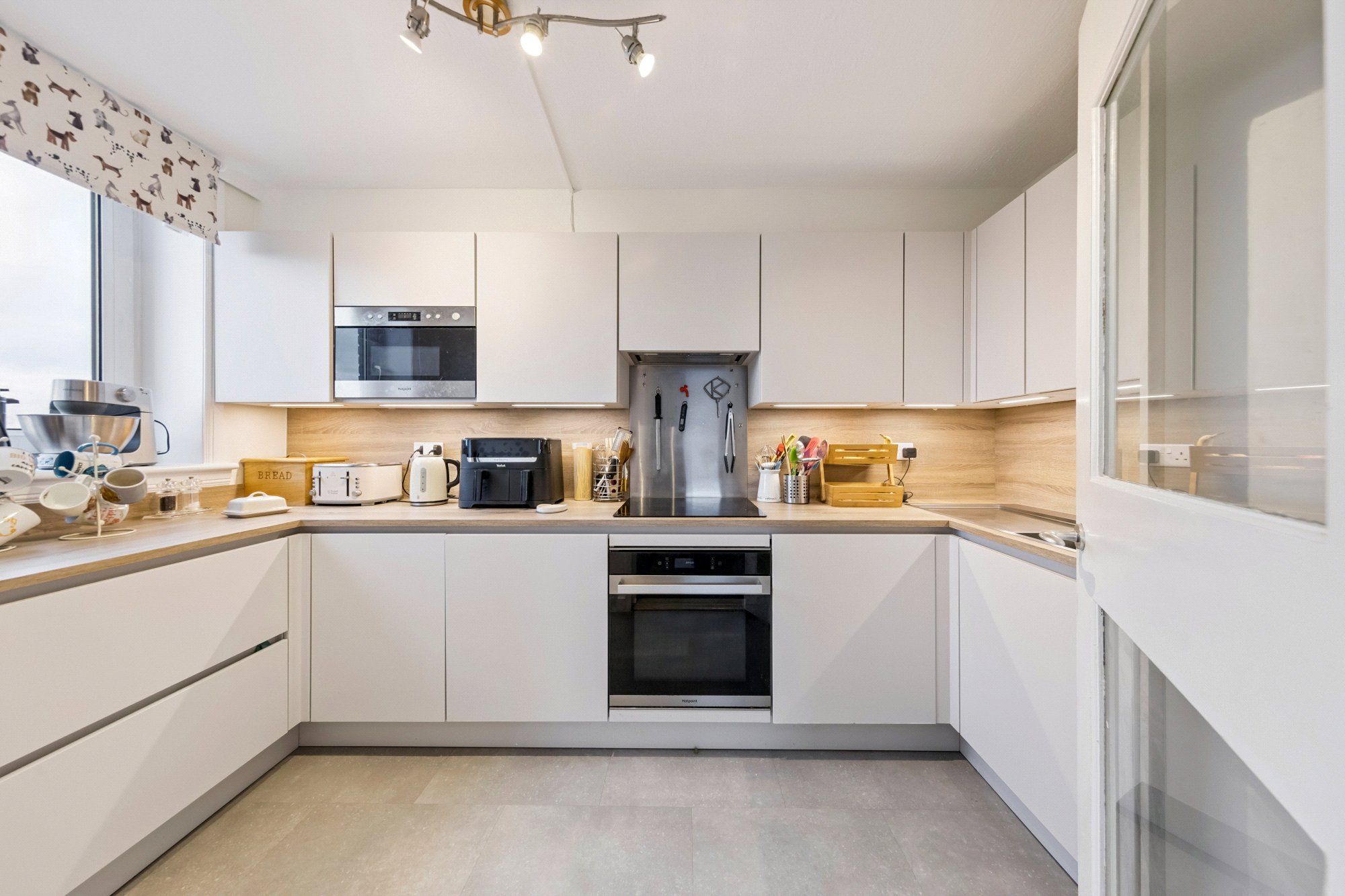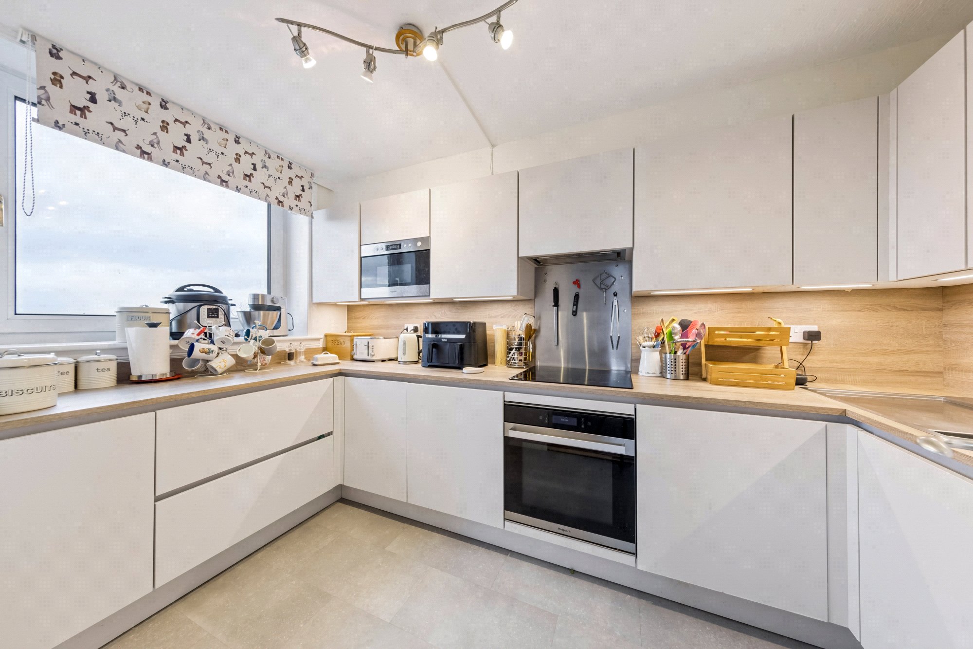 - Contemporary fitted kitchen with sleek light cabinetry, worktops, tiled splashback, integrated appliances and window to the side enjoying an open outlook.