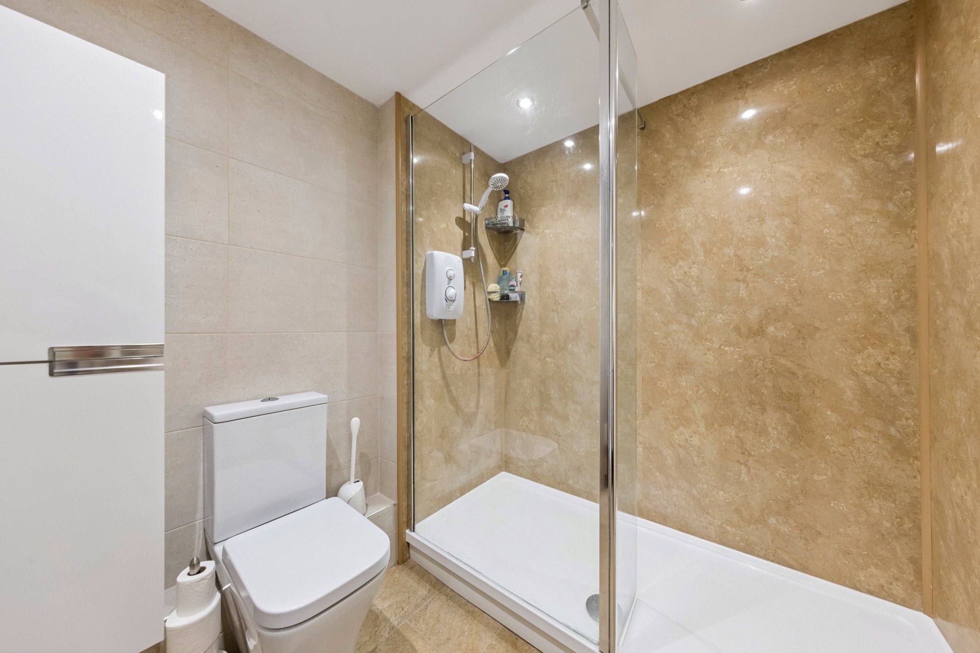 - Stylish three piece shower room with walk-in shower enclosure and electric shower, wc and wash hand basin, finished with quality tiling.