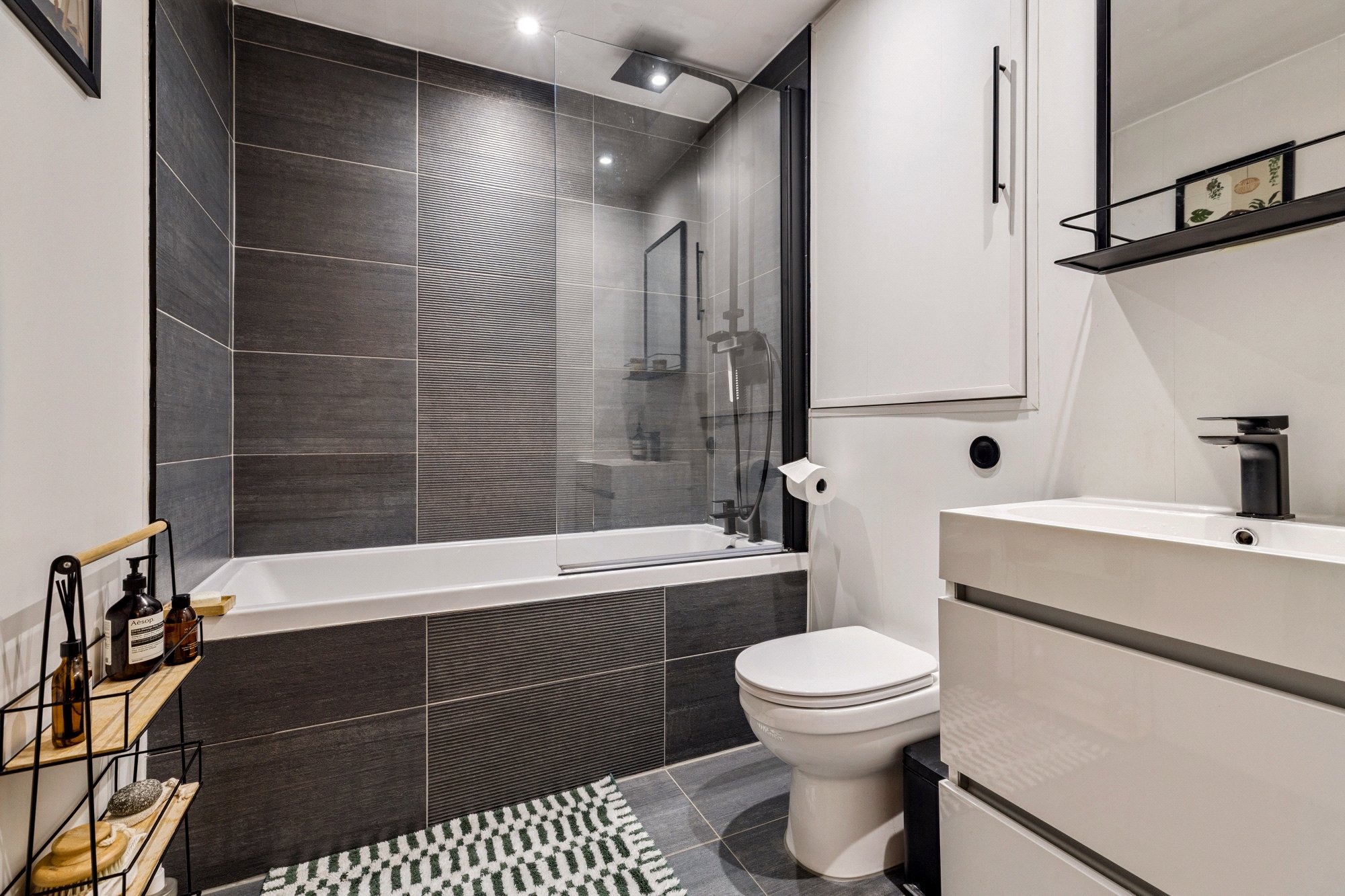 - Three-piece bathroom comprising bath, over bath shower, toilet and wash hand basin