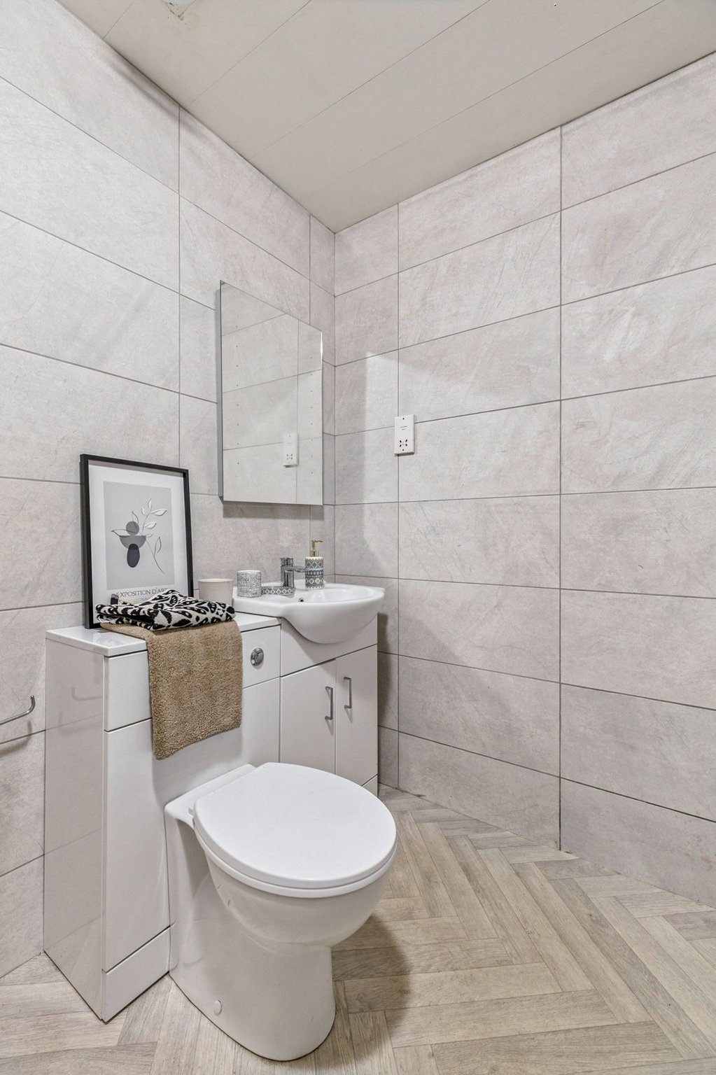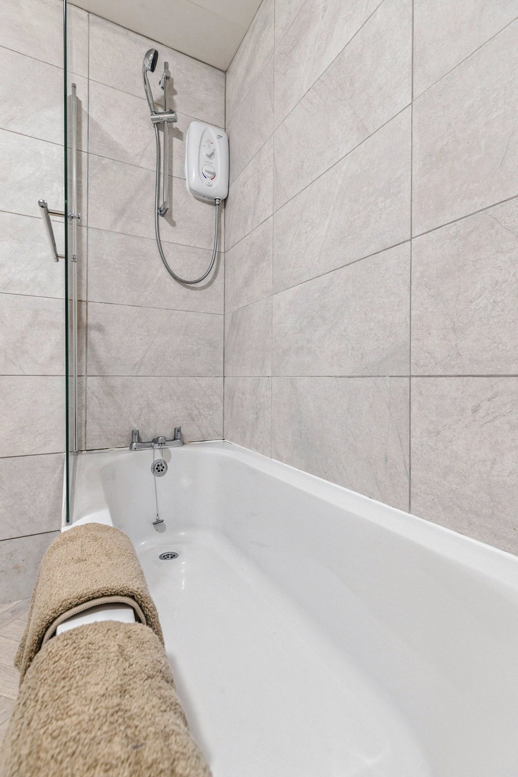 Both bedrooms are well proportioned double rooms, each freshly decorated and newly carpeted. The principal (main) bedroom benefits from a built-in mirrored wardrobe while the second bedroom offers flexibility as a guest room, home office, or additional living space. The bathroom has also been fully modernised with a tasteful tiled finish and features a white three-piece suite with an electric shower over the bath.