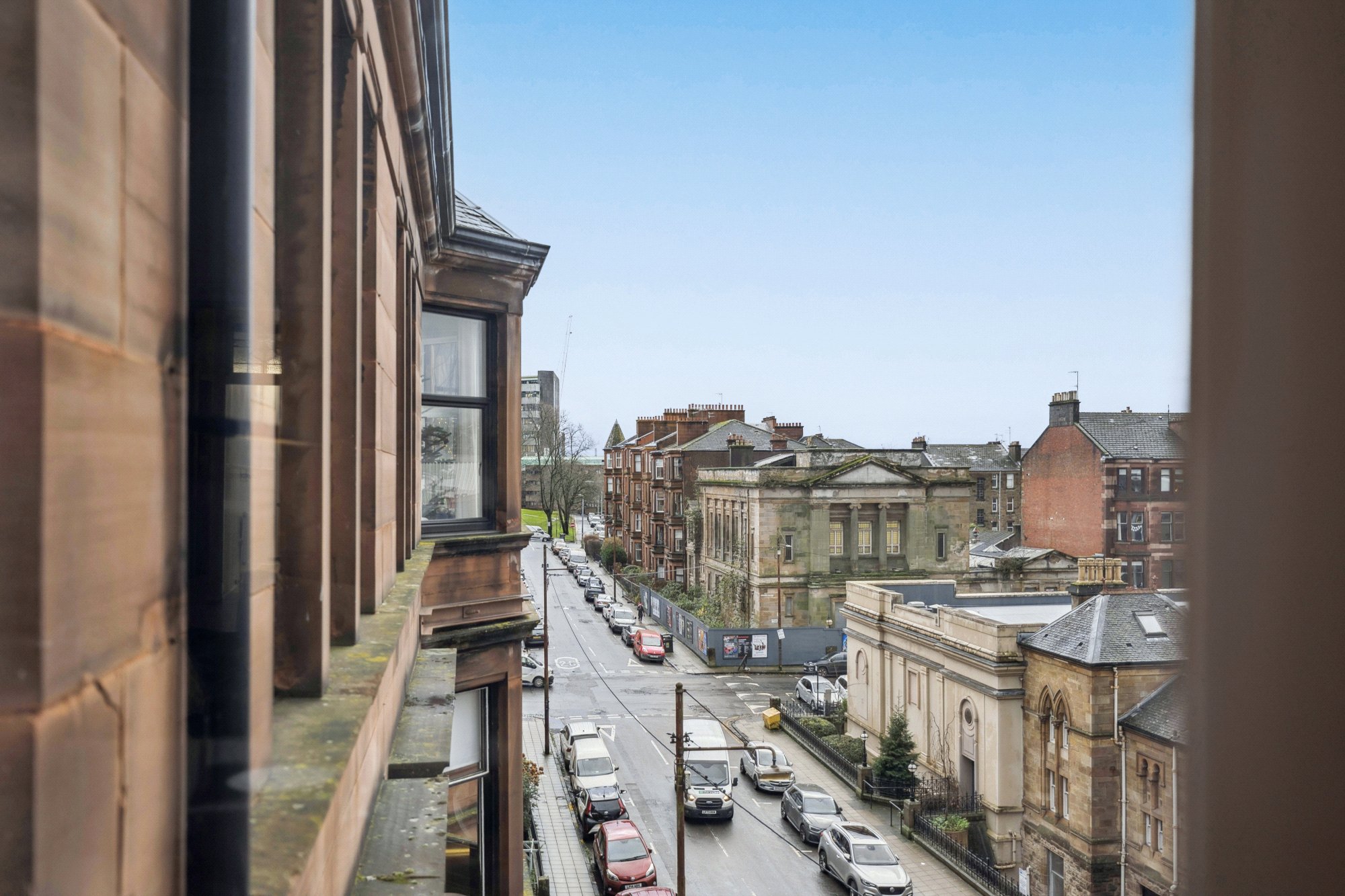 Located at the edge of Hillhead, just off Byres Road in the heart of Glasgow’s West End, this beautiful traditional apartment occupies a superb, central position. The property is a substantial two-bedroom tenement apartment with lovely traditional features, held within an attractive red sandstone tenement that overlooks the pretty Western Baths. The Baths building is illuminated at night, creating a superb foreground to the property’s gorgeous rooftop, cityscape view. Just along the road from Crabshakk Botanics and only a ‘hop, skip and a jump’ from Waitrose at the top of Byres Road, 11 Cranworth Street is hard to fault in terms of centrality. Despite this incredibly convenient setting—within walking distance of all amenities on Byres Road, the lovely hyper local selection along Vinicombe Street, and the cafés and restaurants near the Botanic Gardens on Great Western Road—Cranworth Street is a surprisingly peaceful address. The home for sale, being a top-floor example, is extremely quiet and enjoys wonderful levels of privacy – number 11 being much taller than the buildings opposite and therefore giving this charming apartment a very broad and open outlook.