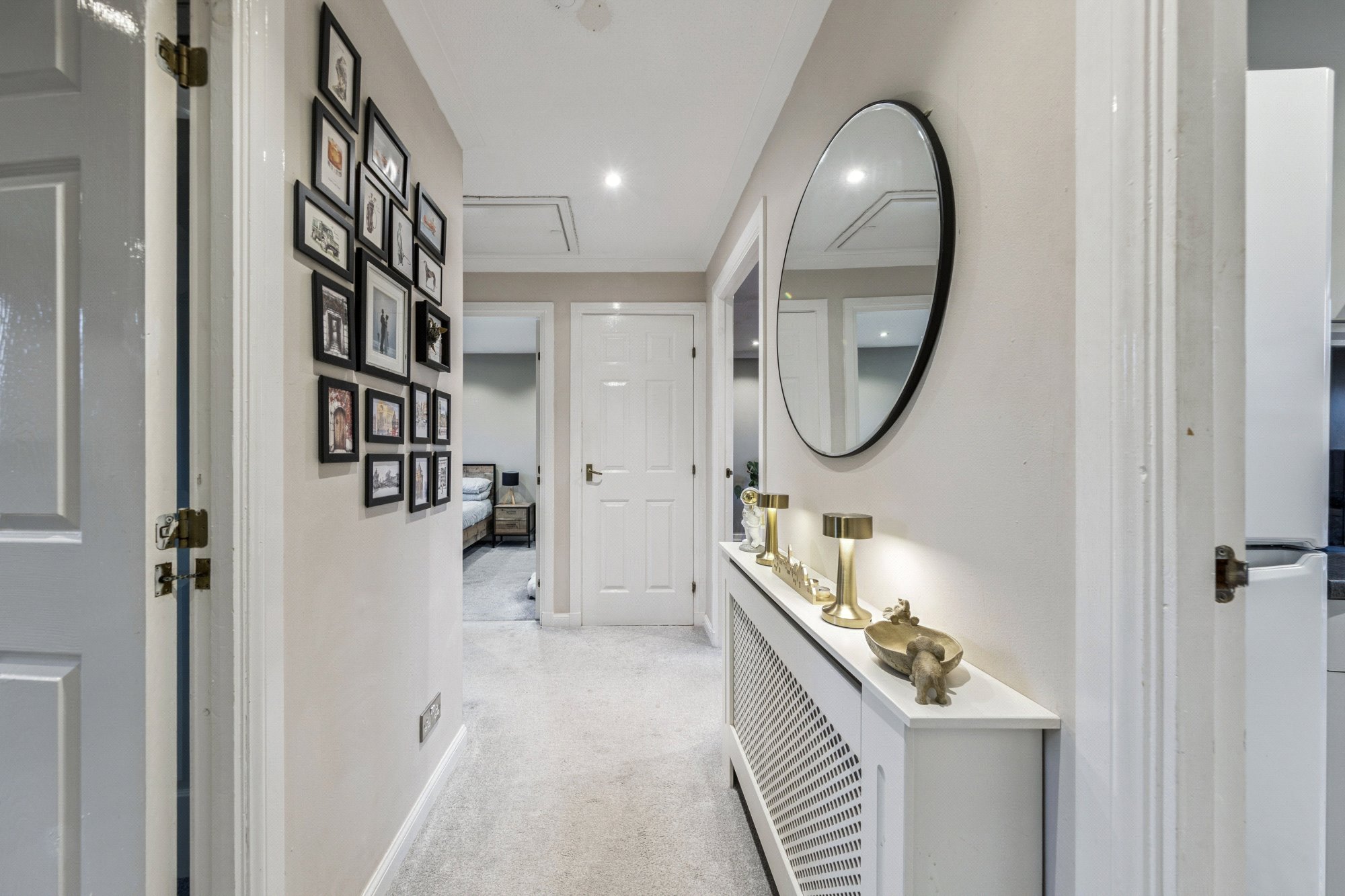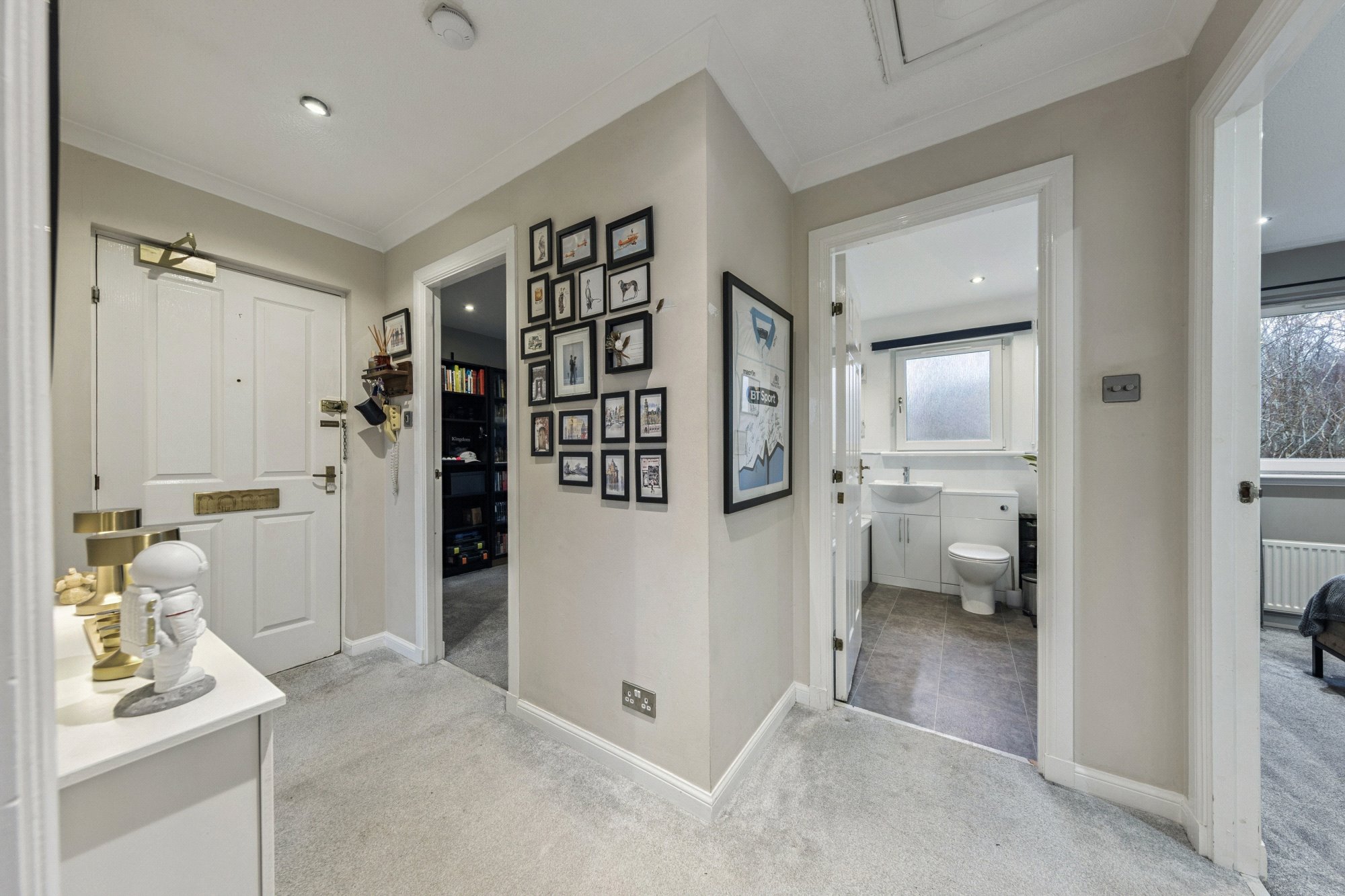The apartment for sale is held within an attractive modern low-rise development which is externally presented in blonde facing brick and cream coloured harling which combine beneath a pitched & tiled roof to create an attractive appearance, with a backdrop of mature woodland. The communal garden spaces are maintained to a high standard by the appointed factor and as mentioned the address has both allocated resident’s parking spaces and spaces for visitors to park in too. Access to number 20 is via a secure entrance door with intercom entry system. Once inside, a neat and well-lit communal hall and stairway provide access up to the third floor.