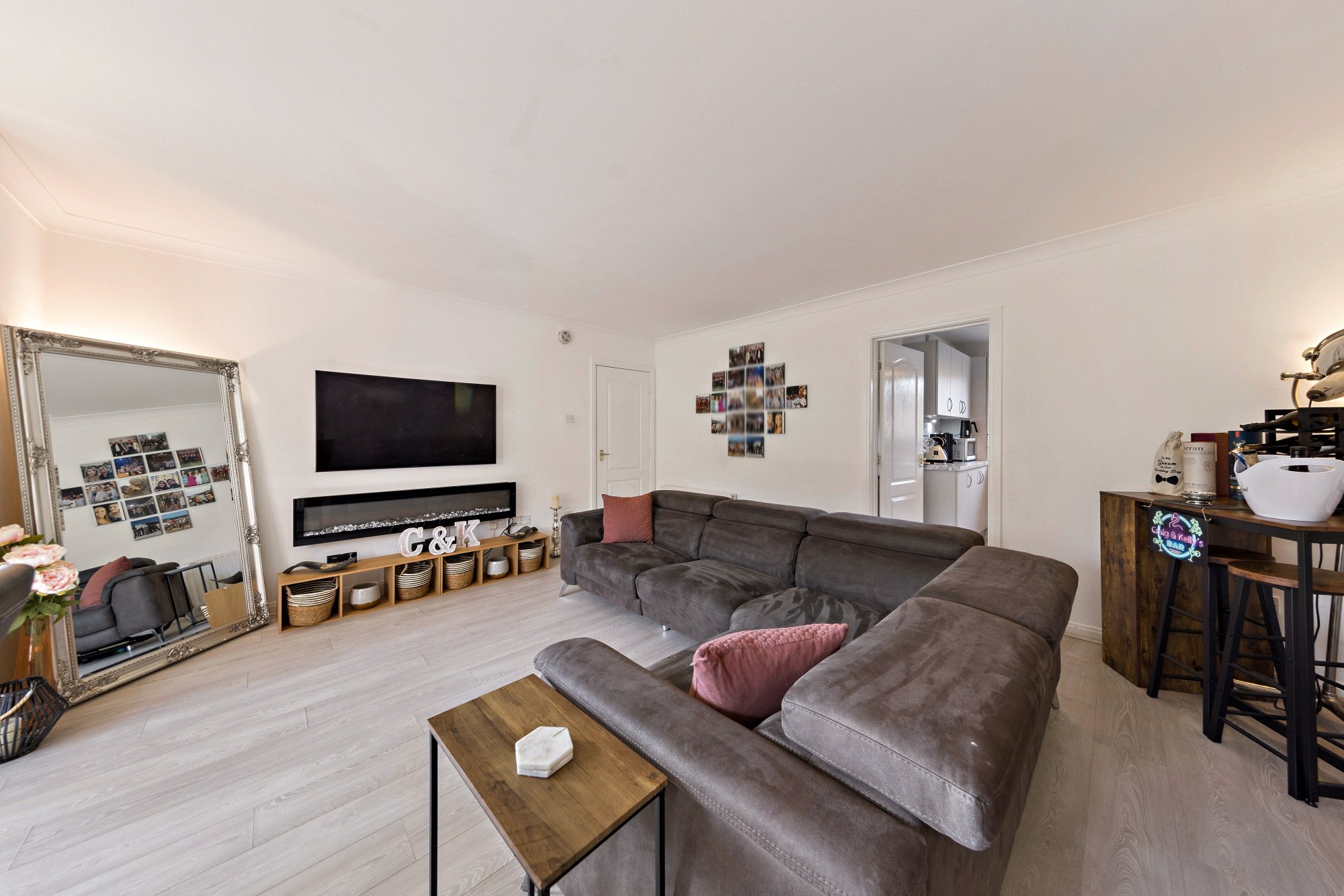 There are two well-proportioned bedrooms. The principal bedroom is of king-sized proportions, complete with fitted wardrobes and access to an attractive en-suite shower room, finished with neutral tiling, contrasting patterned flooring, a vanity unit with mirror and a low-level shower enclosure. The second bedroom is also a comfortable double, benefitting from an in-built wardrobe and offering flexibility for use as a guest room or home office.