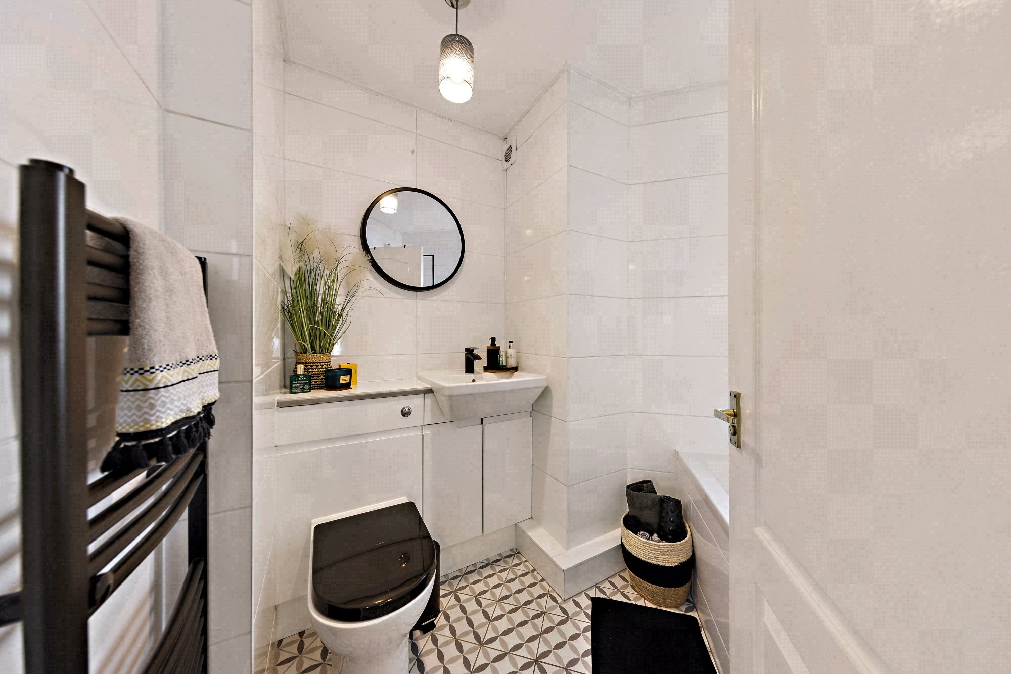 The main bathroom is distinctive in its angular design and is finished in a style that complements the en-suite, featuring white glossy tiling, patterned flooring, a side-by-side WC and wash hand basin set within a vanity unit, and a bath with shower over.