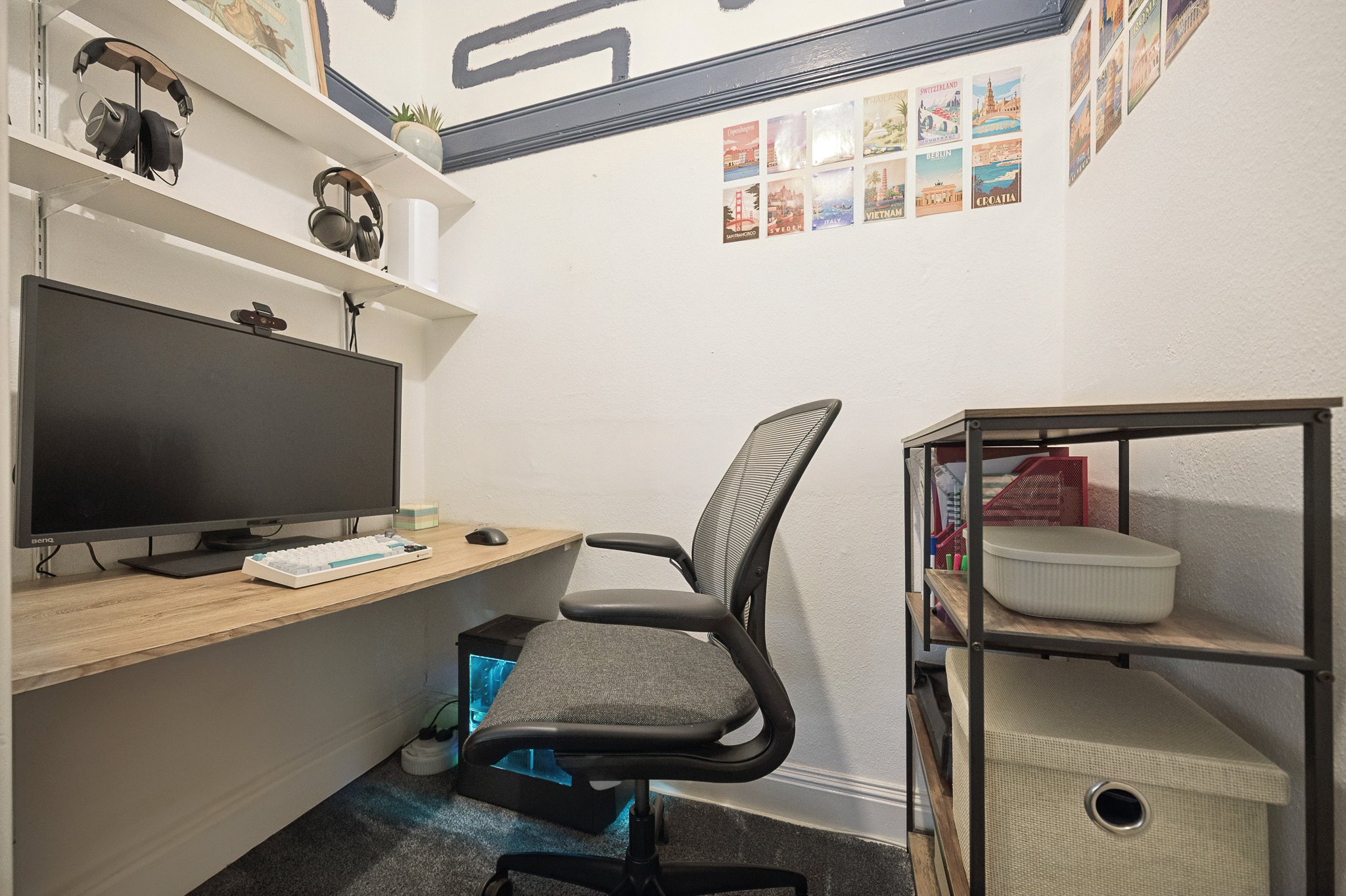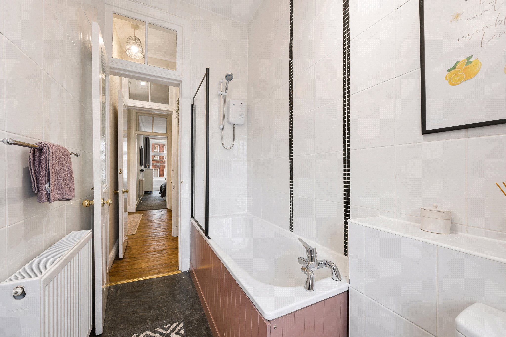 To the rear, the dining kitchen is a particularly impressive feature of the home. Of superb proportions for a one-bedroom apartment, it offers ample space for both cooking and dining, making it a highly sociable and practical environment. The careful upgrading undertaken by the current owners is evident here, with smart cabinetry, generous worktop space and a layout that makes excellent use of the available footprint. It is a bright and airy room that comfortably accommodates a dining table and chairs – perfect for hosting friends or enjoying relaxed evenings at home. The bedroom is of generous proportions and easily accommodates a king-sized bed along with free-standing wardrobes and drawer sets, without compromising on floor space. Completing the accommodation is a well-appointed main bathroom, fitted with a white suite and shower over bath. The finish is clean, fresh and practical, complementing the overall standard of presentation found throughout the home.