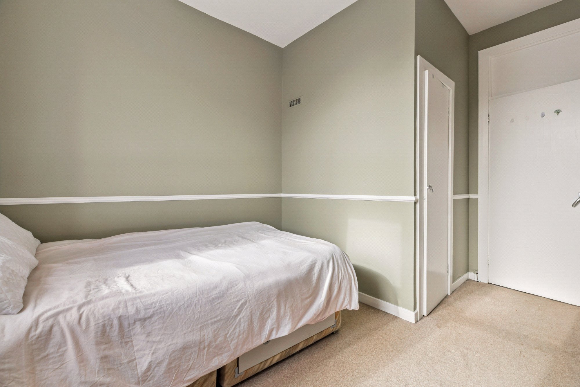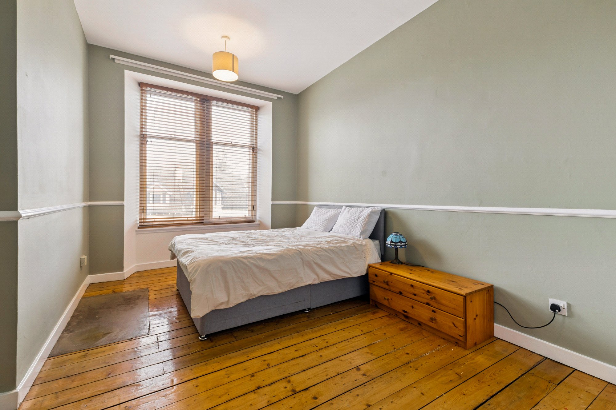 - Bedroom with two section window to the front, wooden flooring and storage cupboard
