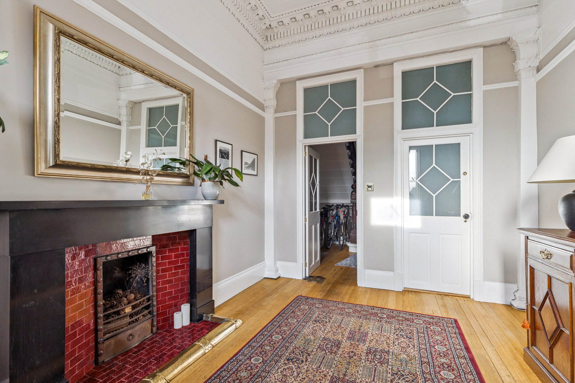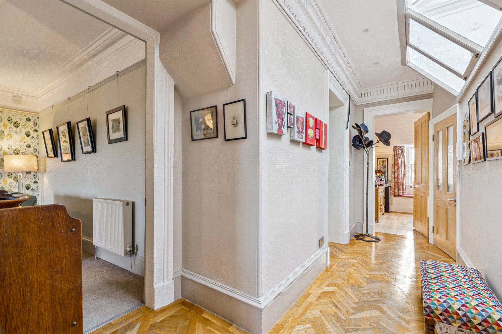 - Inviting reception hallway with herringbone flooring, ceiling cornice and skylight windows.