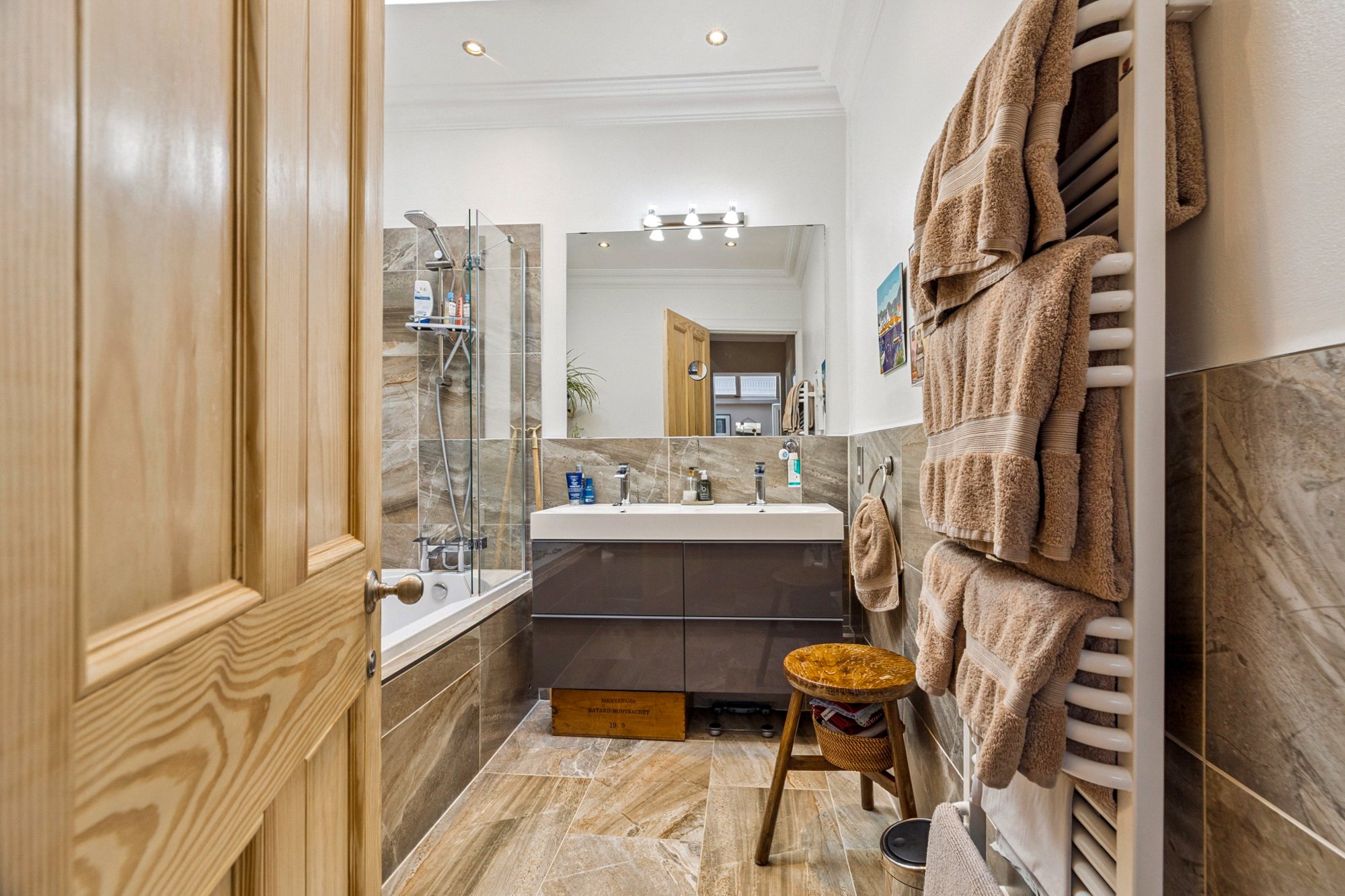 Owing to the property’s elevated aspect, several vantage points grant open green outlooks across treetops and traditional chimney pots towards Dumgoyne and the Campsie Fells, with Ben Lomond visible on clear days, an absolutely delightful backdrop to be enjoyed from one’s living room and kitchen.