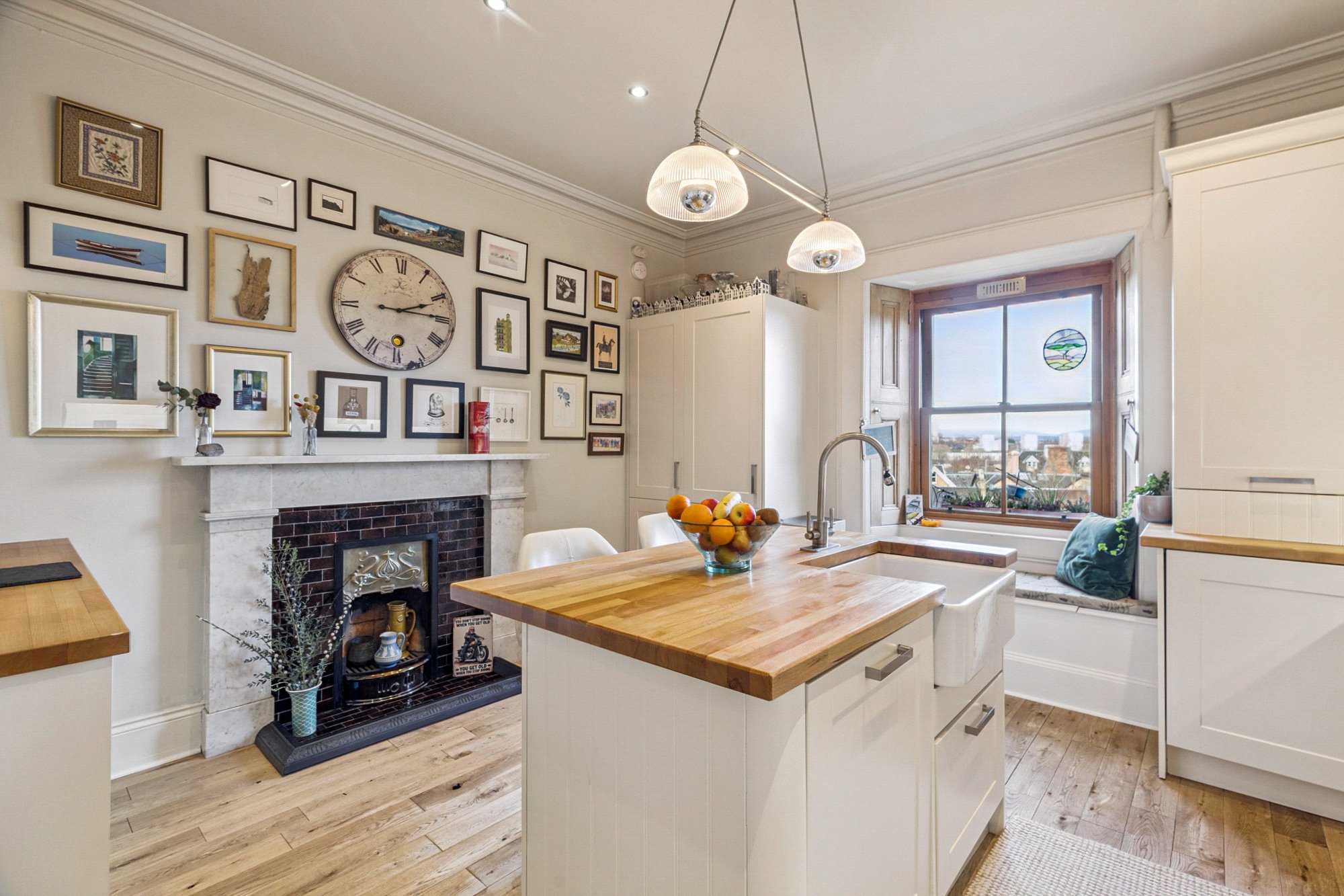 - Fetching fitted kitchen with wall and base units, butcher block counter tops, central breakfasting island with ceramic Belfast sink, range cooker, integrated appliances, focal point Carrara marble fireplace, pendant light and gorgeous outlook from a window to the rear with shutters.