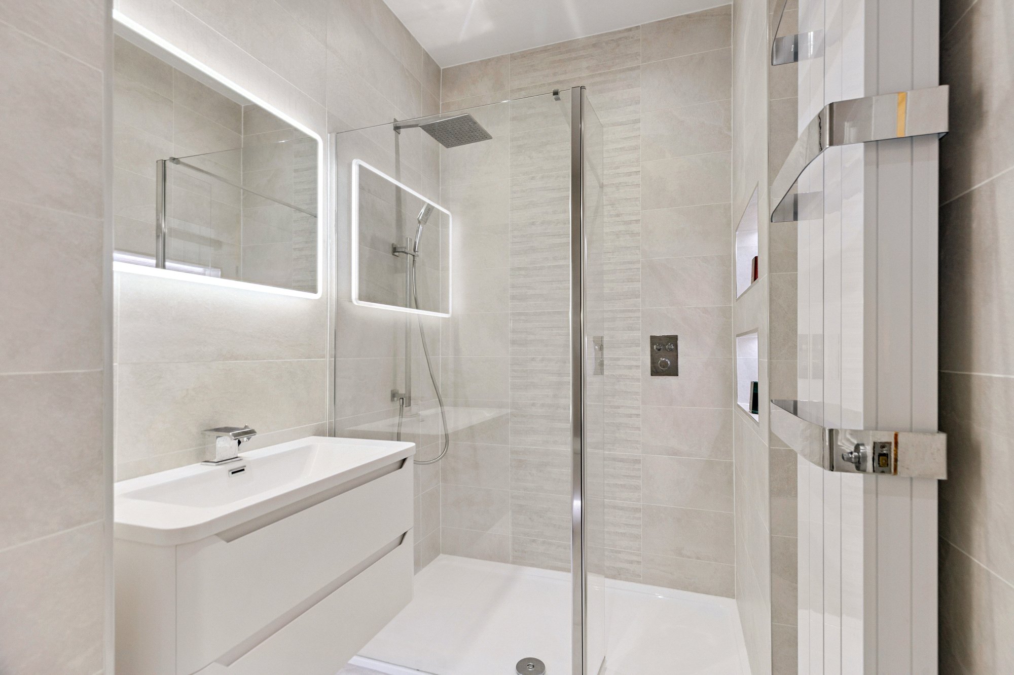 - Beautifully appointed contemporary shower room with walk-in shower cubicle, self-illuminating vanity unit and modern tiling.