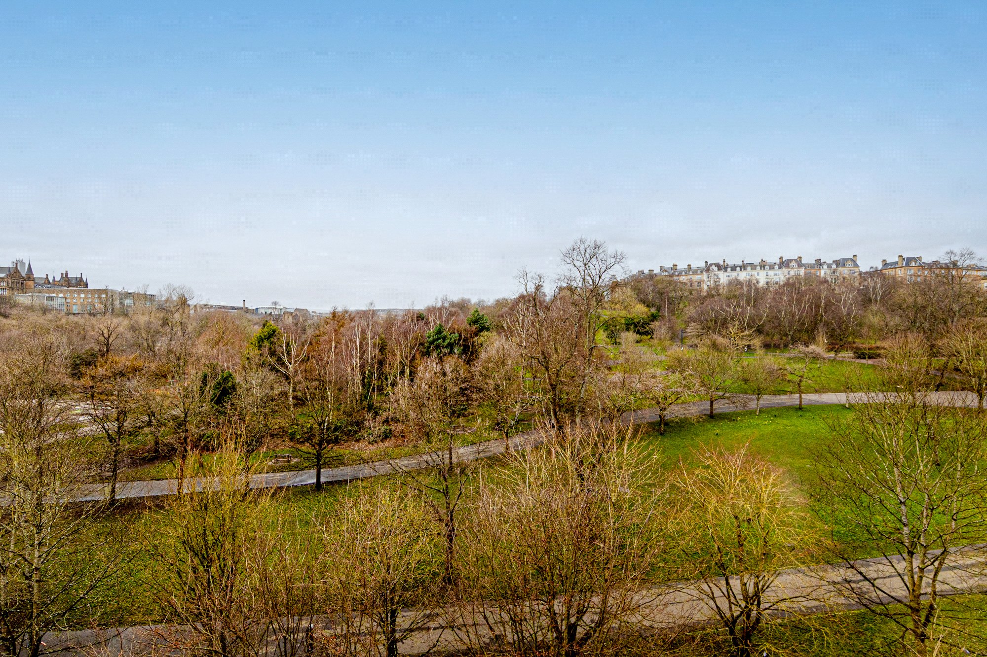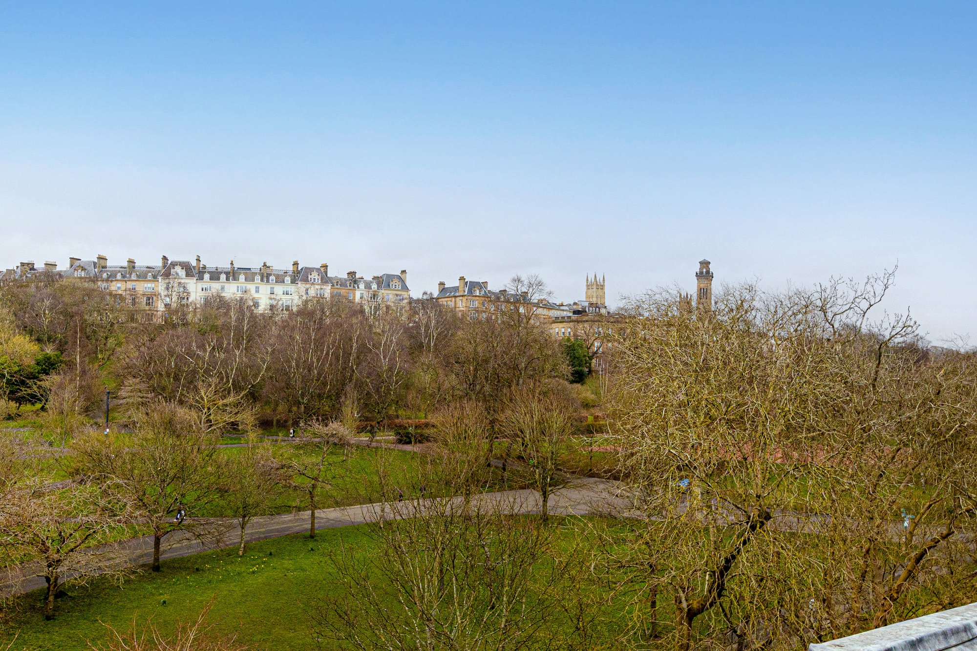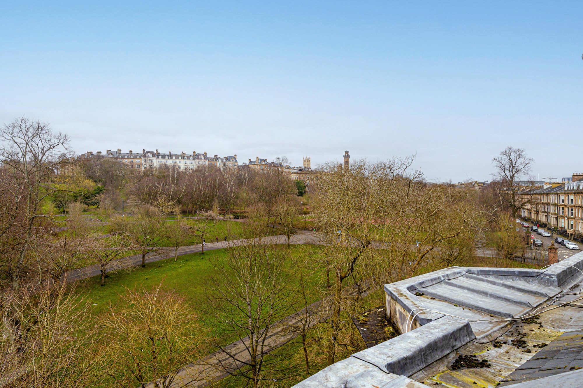 The apartment enjoys a wonderfully peaceful elevated position on the top floor, where the outlook to the front becomes the true centrepiece of the home. From the elegant three-section bay window, the eye is drawn across the uninterrupted greenery of Kelvingrove Park, with its mature trees, winding pathways and open lawns stretching away towards the striking terraces of the Park District beyond. It is a particularly captivating perspective that changes beautifully with the seasons and provides a sense of openness and calm rarely found so close to the city centre.