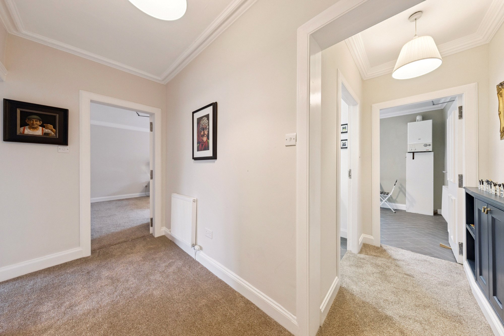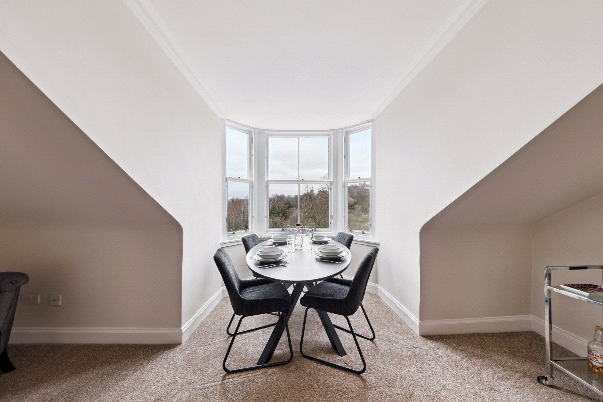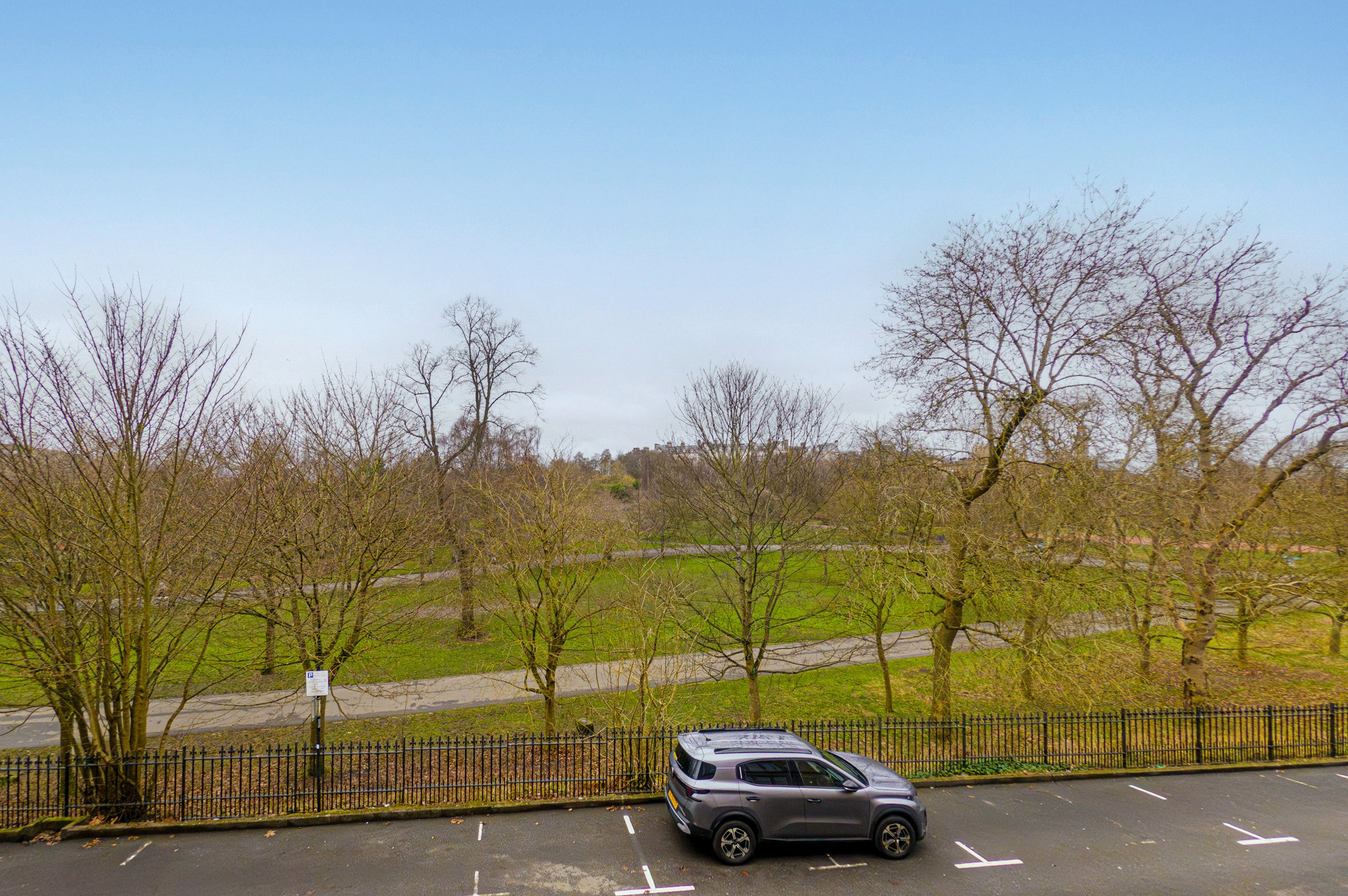 The apartment enjoys a wonderfully peaceful elevated position on the top floor, where the outlook to the front becomes the true centrepiece of the home. From the elegant three-section bay window, the eye is drawn across the uninterrupted greenery of Kelvingrove Park, with its mature trees, winding pathways and open lawns stretching away towards the striking terraces of the Park District beyond. It is a particularly captivating perspective that changes beautifully with the seasons and provides a sense of openness and calm rarely found so close to the city centre.