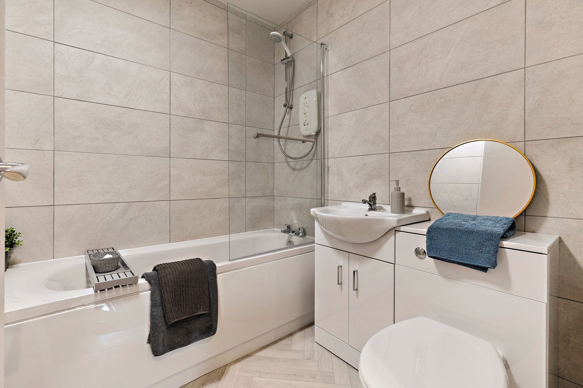 - Modern three piece bathroom with white suite and electric shower over bath.