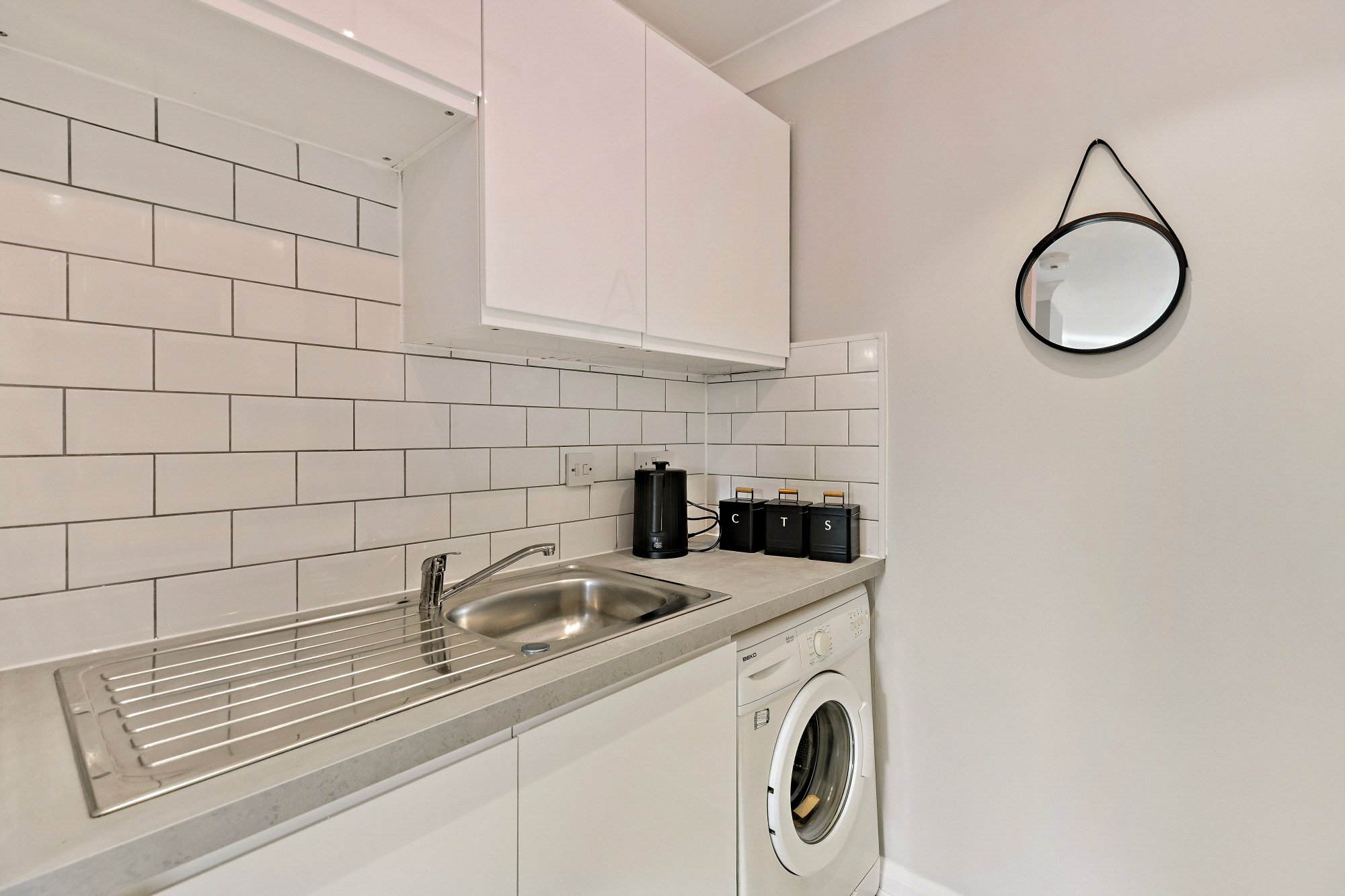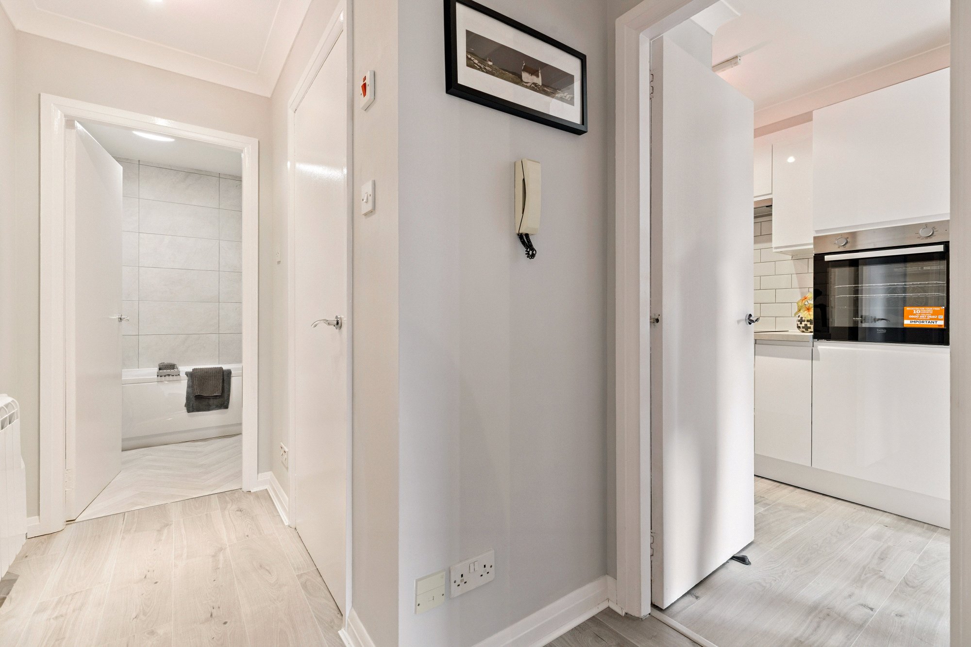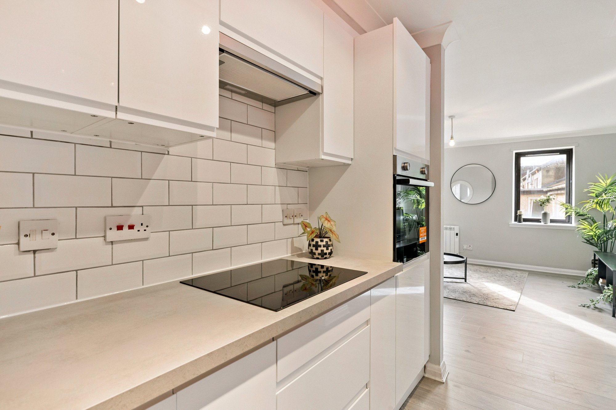 The property has been carefully refurbished and offers a well-considered semi - open plan layout, enhanced by excellent natural light from westerly twin windows within the main living area. The fitted kitchen features sleek white gloss units, contrasting grey worktops, and a white tiled splashback.