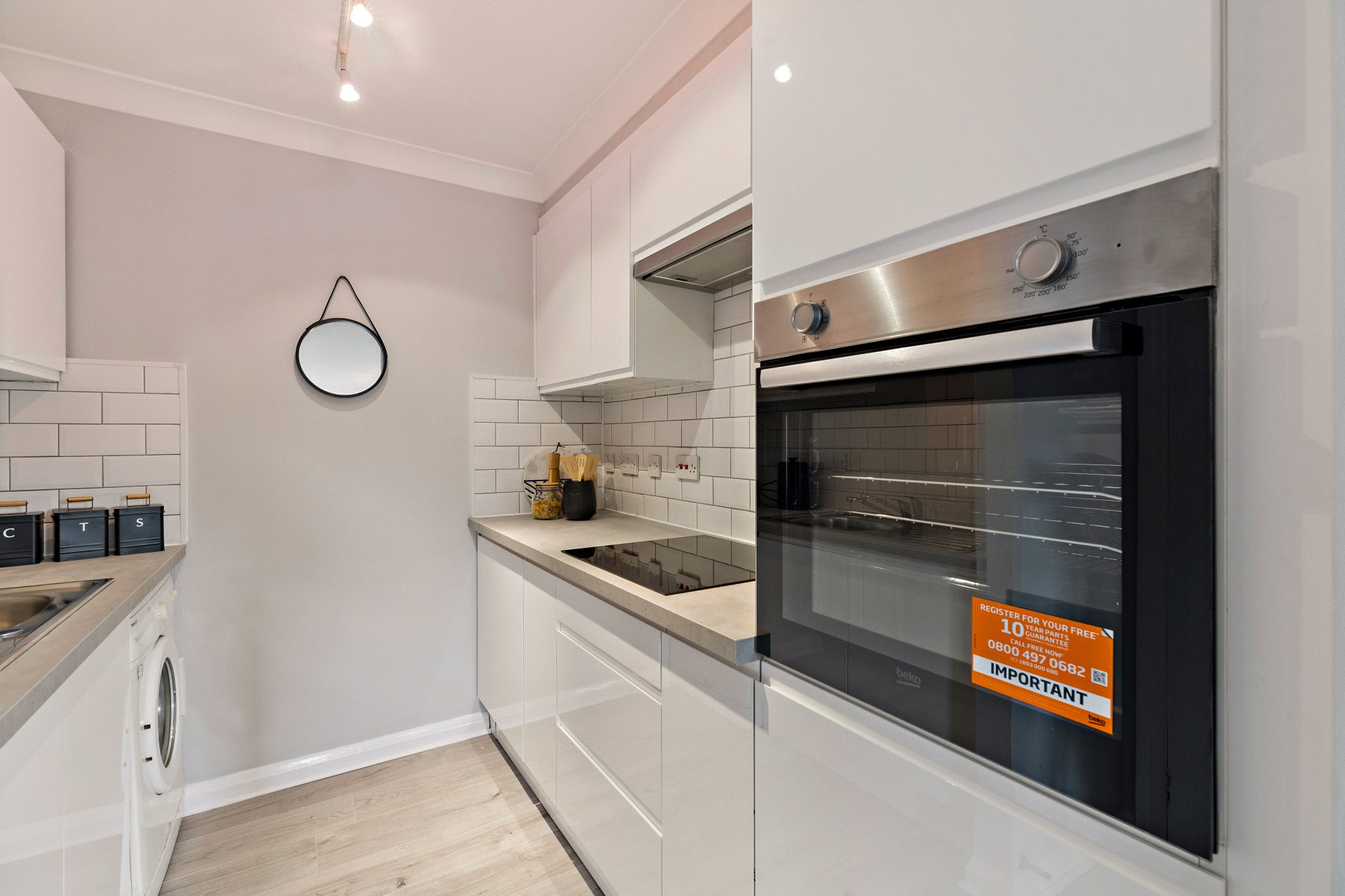 - Contemporary semi-open plan kitchen with oven, hob, extractor, freestanding washing machine and integrated fridge.