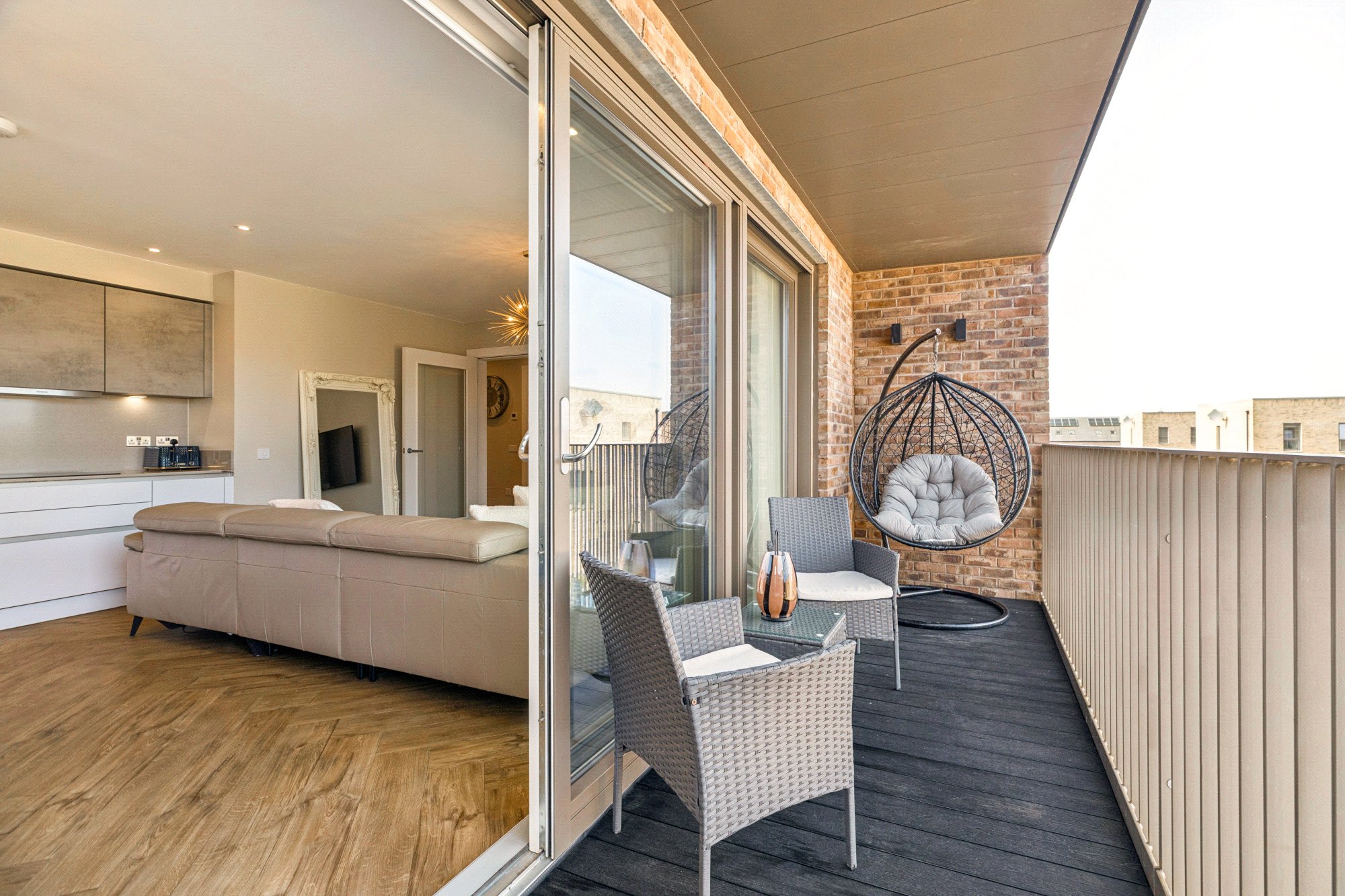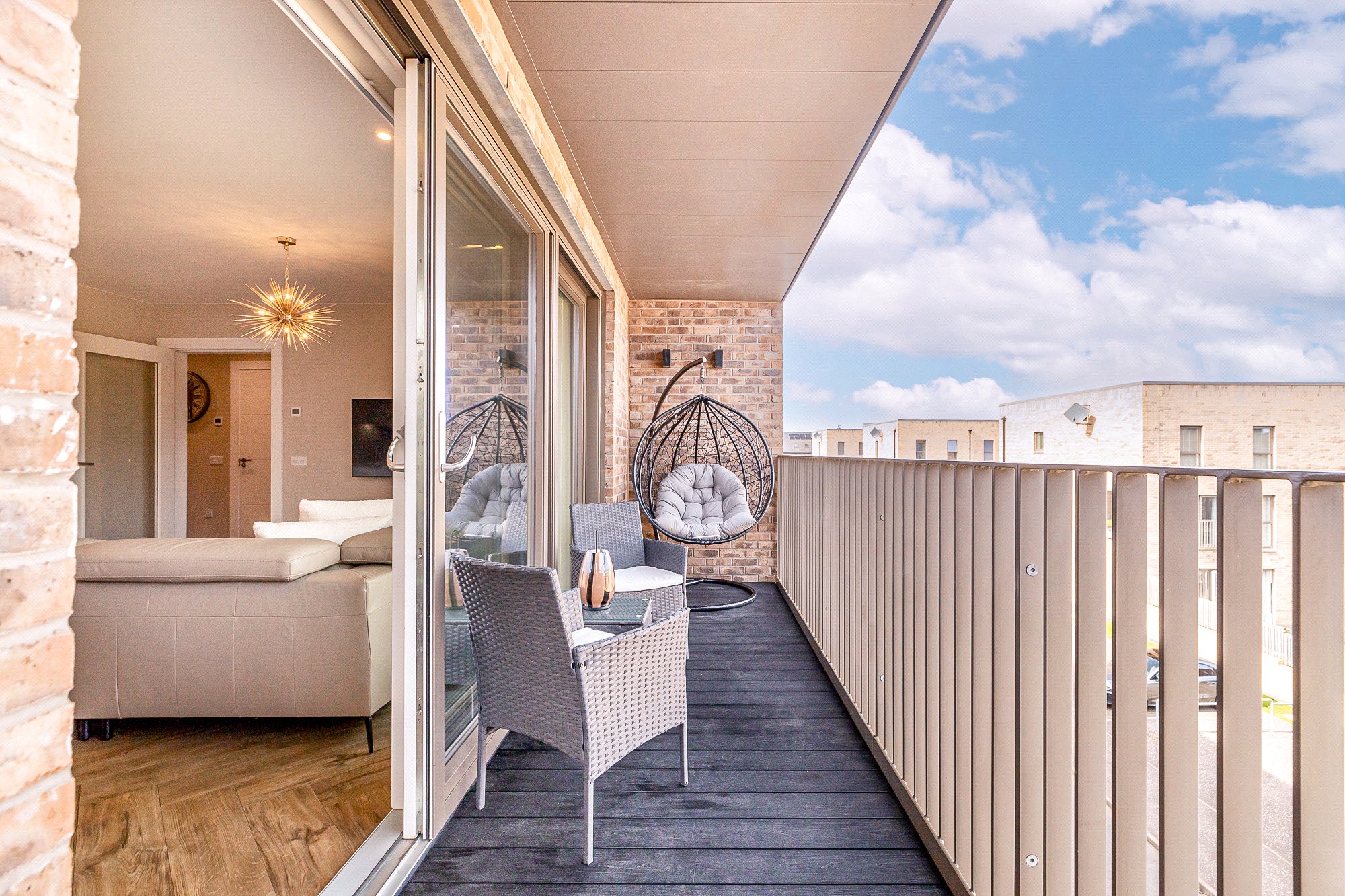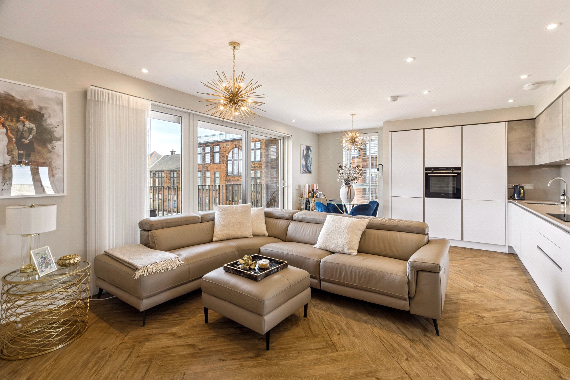 The stunning open plan kitchen has been thoughtfully designed with both style and functionality in mind, featuring contemporary units, quality integrated appliances, and ample workspace. The apartment boasts two well-proportioned double bedrooms, both benefiting from fitted wardrobes, while the principal bedroom is further enhanced by a stylish en suite shower room. A contemporary four-piece bathroom suite completes the internal accommodation, finished to a high standard with modern fittings.