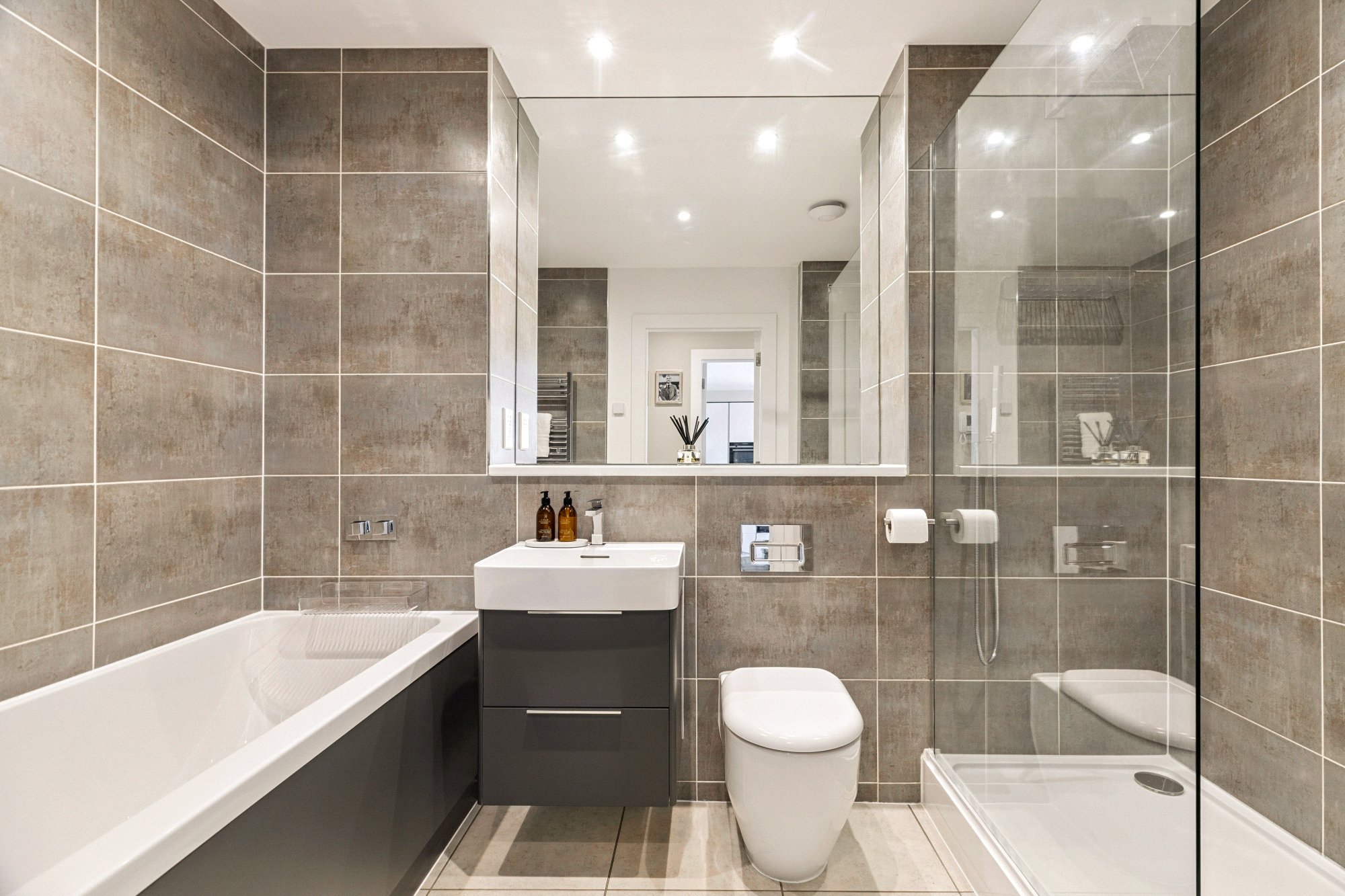 - Contemporary four-piece bathroom comprising bath, separate shower enclosure, toilet and wash hand basin