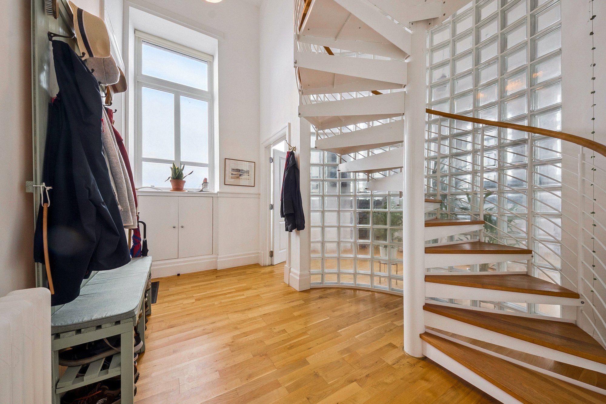 The accommodation on the entrance level is completed by a well-proportioned double bedroom. A striking spiral staircase rises to the upper level, where the principal bedroom offers generous proportions along with integrated wardrobe space. The main bathroom is also located on this level and is fitted with a white three-piece suite including a shower over the bath.