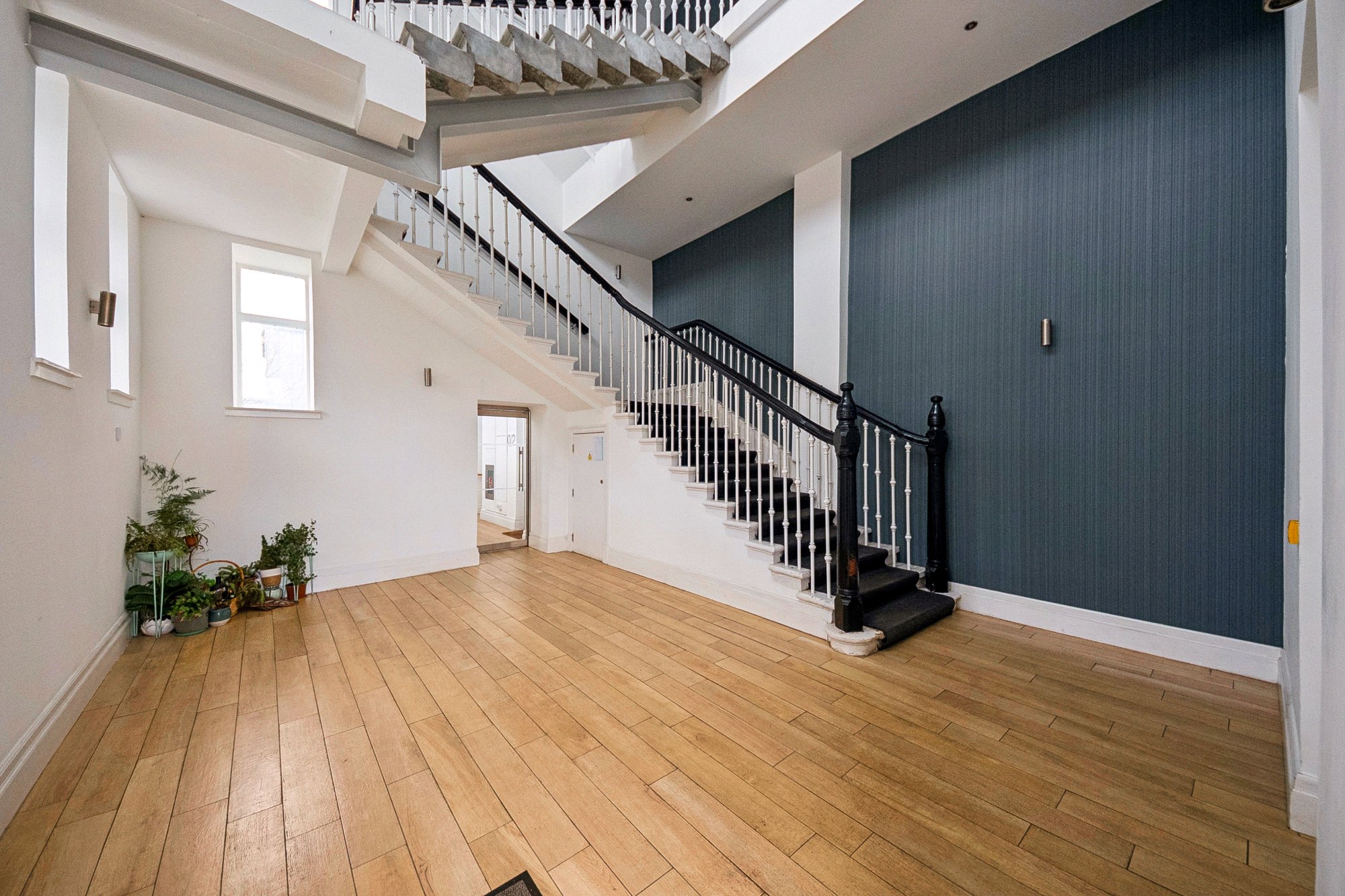 The property forms part of an award-winning redevelopment of the former school, originally constructed in 1875 and opened in 1884, which was thoughtfully converted in 2011 into a collection of distinctive luxury apartments. The architect-led project, overseen by Grant Murray, was recognised with multiple awards and carried out with great sensitivity to the building’s rich heritage. As a result, the development retains a wealth of original character, most notably within the breathtaking communal atrium, where a grand suspended staircase creates an immediate sense of drama and arrival.