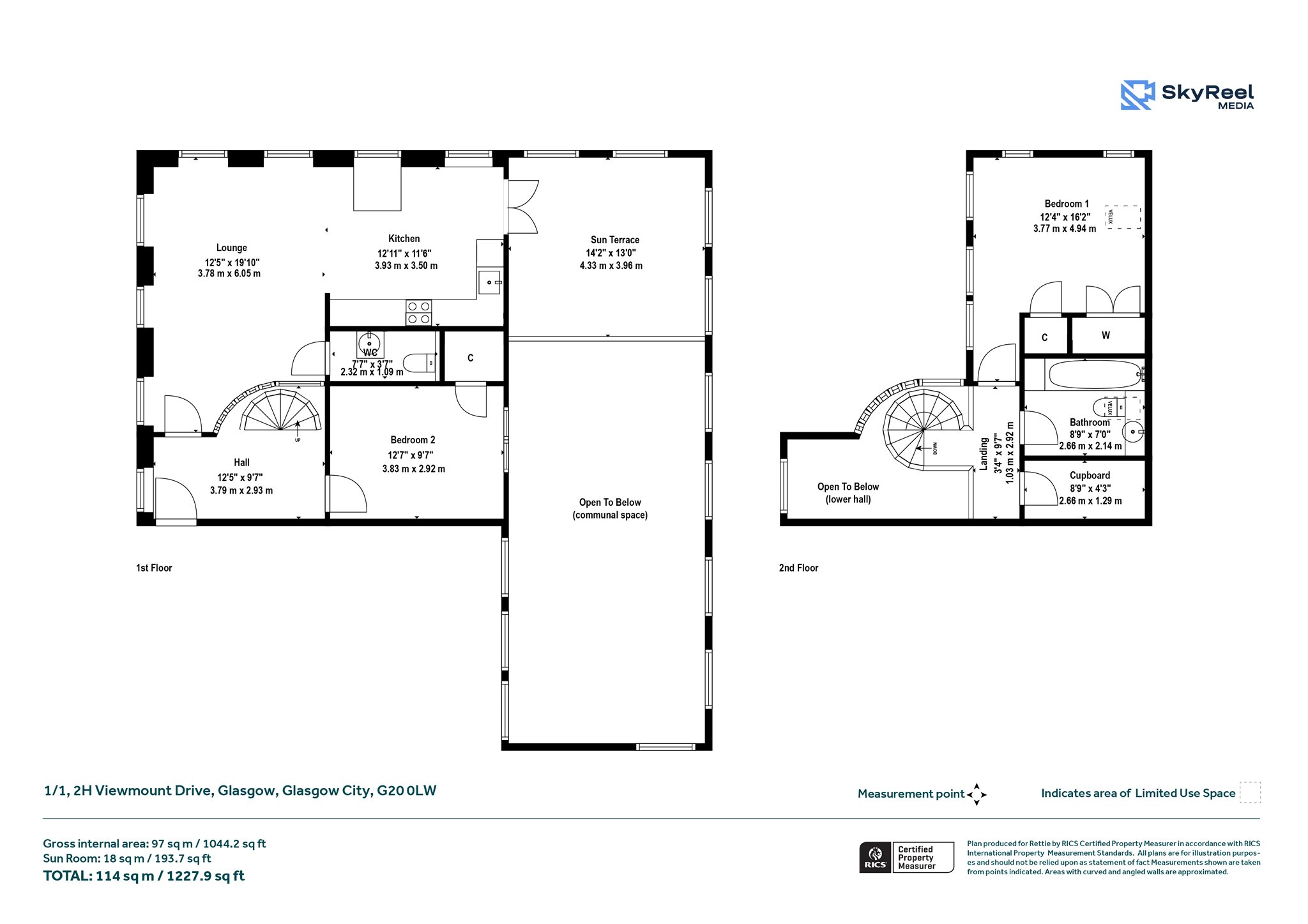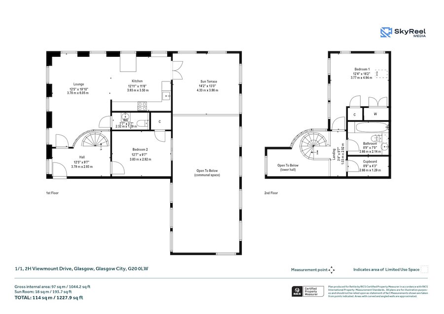 - Two double bedrooms across split-level layout