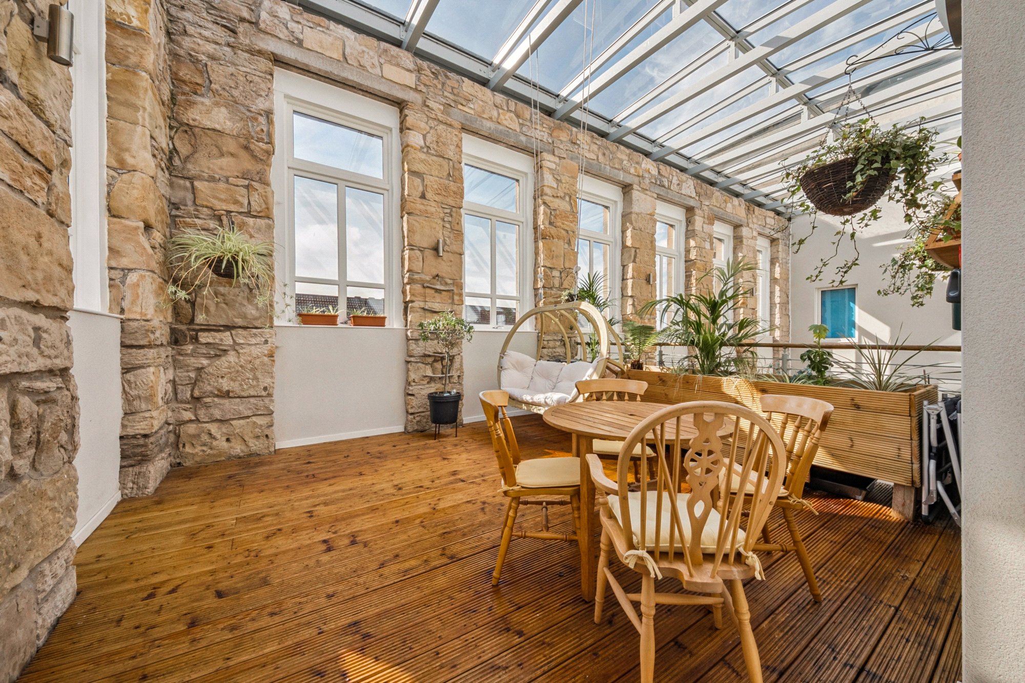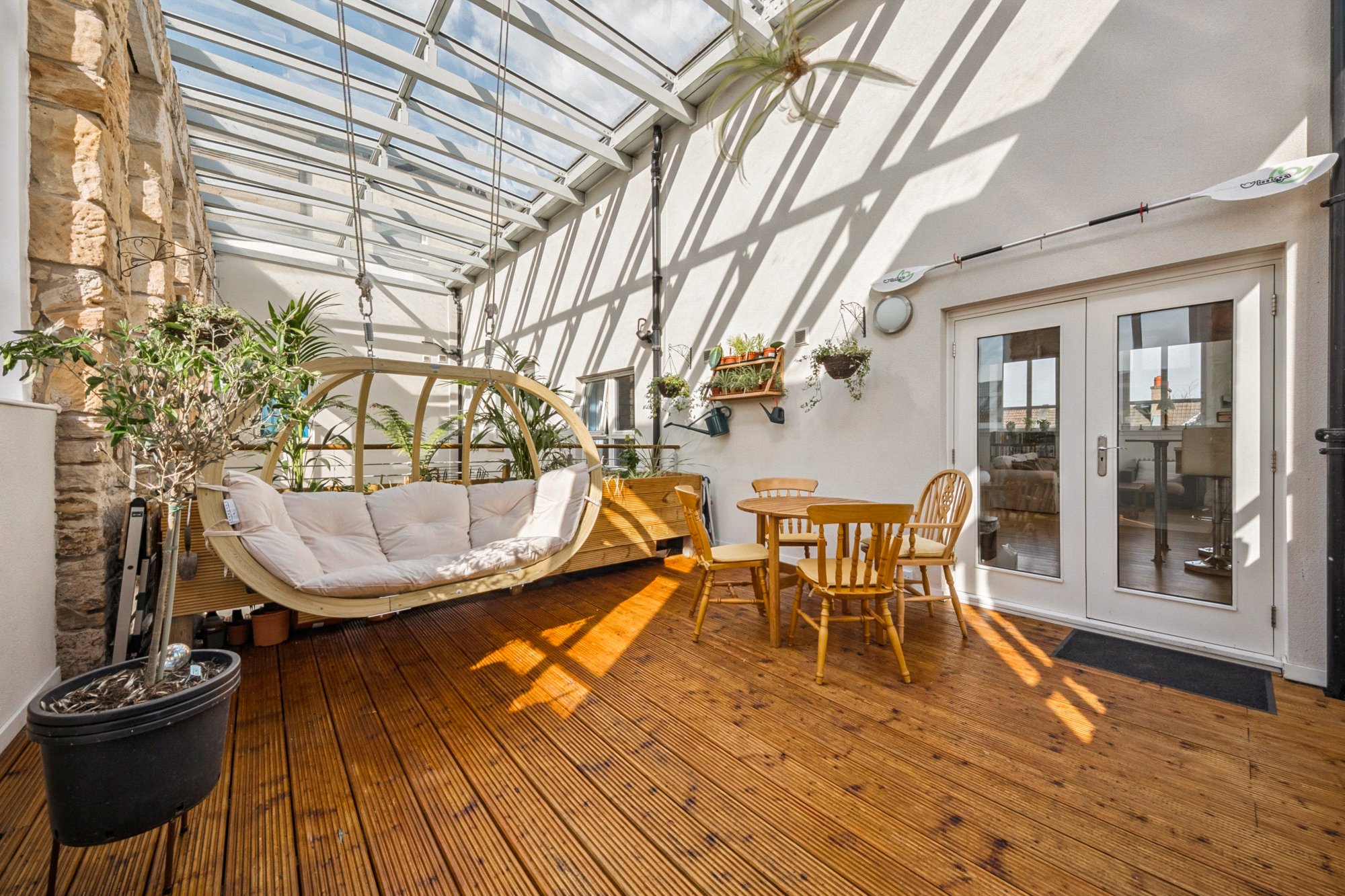 - Covered private sun terrace with bespoke planters and timber hanging swing chair