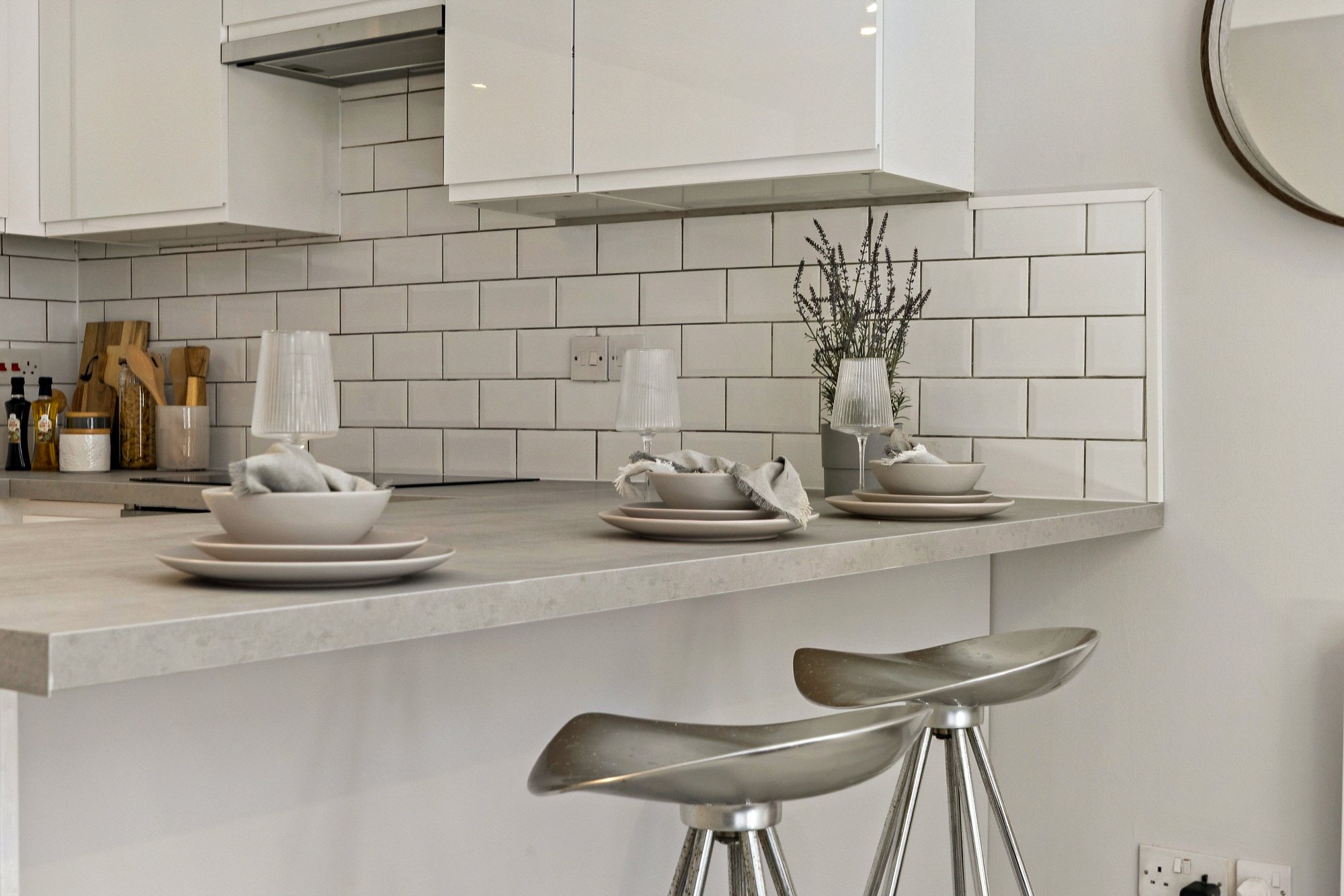 The property offers a thoughtfully arranged interior with a modern open plan layout and excellent natural light throughout. The main living space is particularly appealing; an airy and comfortable lounge and dining area that opens directly onto a full balcony, providing valuable outdoor space and an ideal spot for relaxing or entertaining. The kitchen is seamlessly integrated, featuring contemporary white gloss units, contrasting worktops, a metallic splashback, and a breakfast bar that enhances the sociable feel of the space.