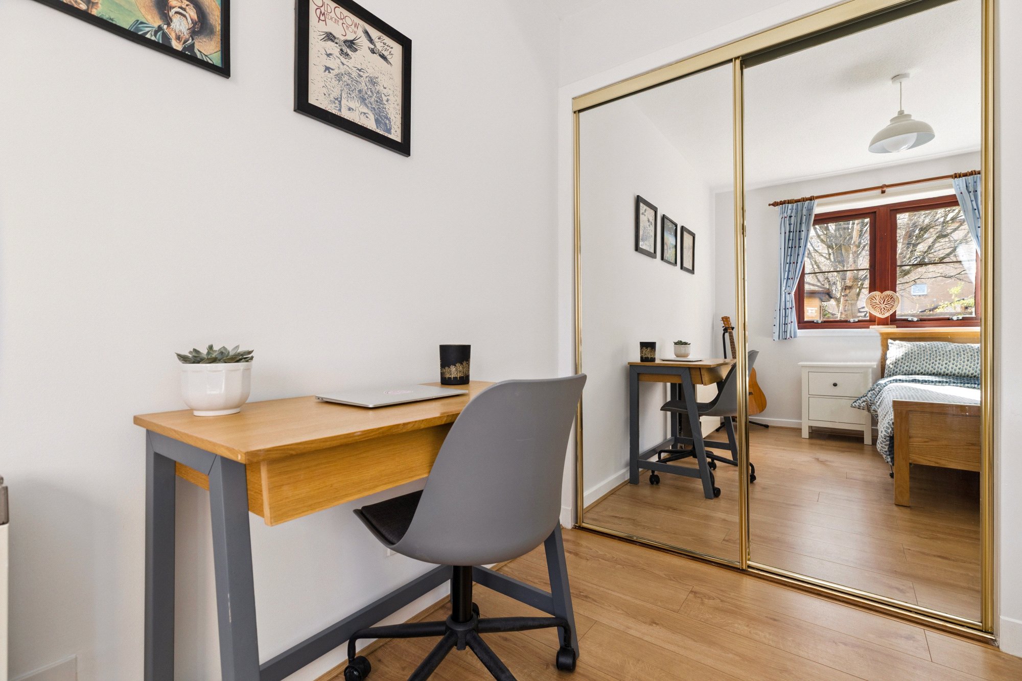 - The principal bedroom has integrated mirrored wardrobes, a useful recess for housing a dedicated work from home space, dressing table, or further storage, while there is a two section window to the rear.