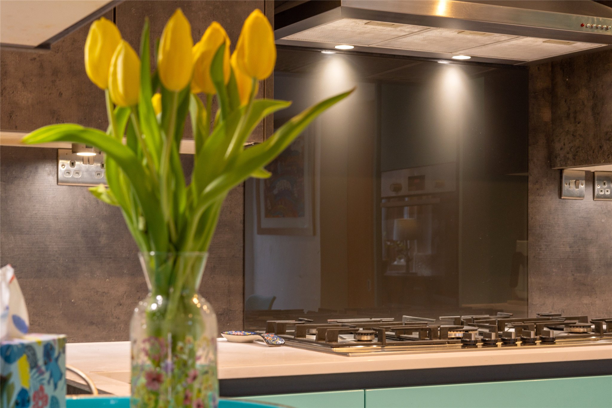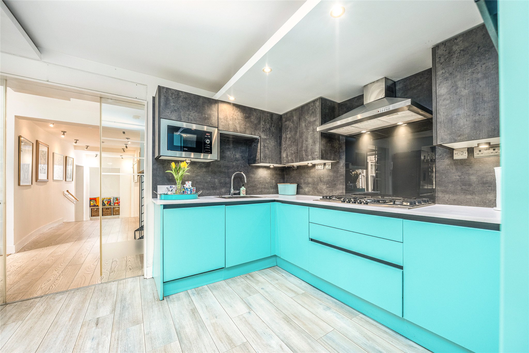 - Returning to the ground floor, a bespoke fitted kitchen immediately grabs our attention, with contrasting dark grey cabinetry, white counter tops and turquoise base units creating a very fetching and lively space. The room has ample space for dining, is brightened by five west and south facing windows, while a very useful office/snug/occasional sleeping space is partitioned by sliding doors.