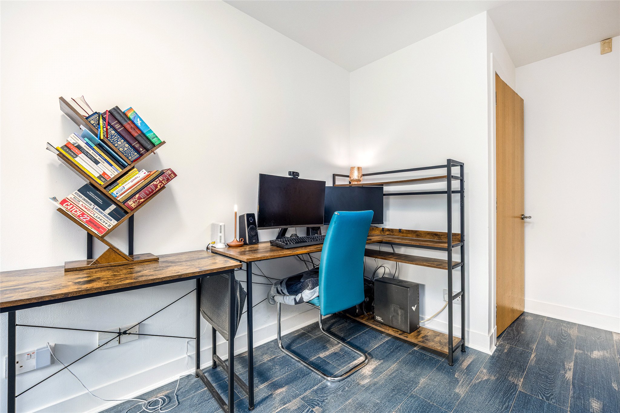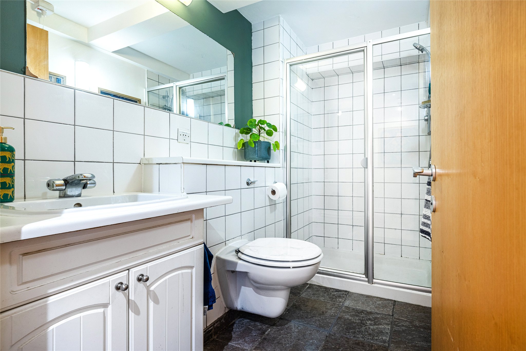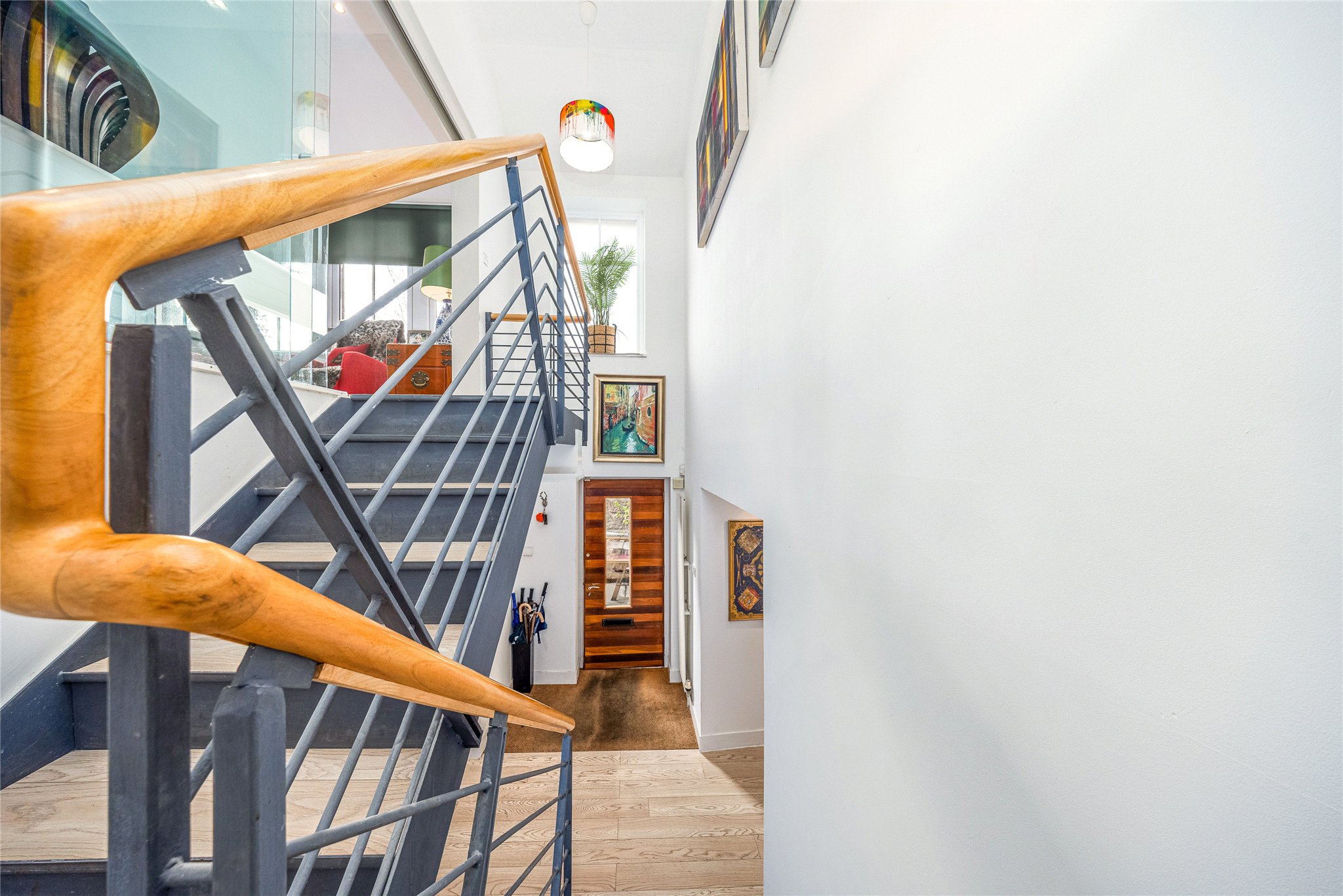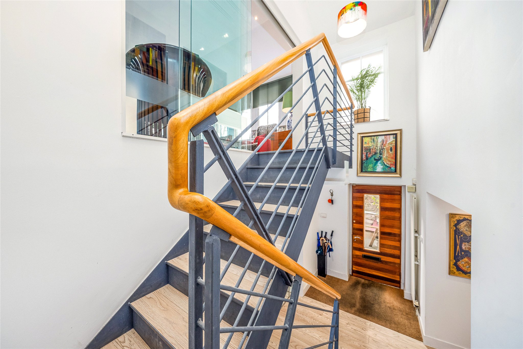 Spanning two levels, the home has a refreshingly pragmatic layout, a stunning living room is set above the beautiful Wren dining kitchen, the two connected by an imposing industrial metal staircase, with contemporary glazed sliding doors and vaulted ceilings that evoke a tremendous sense of scale. The living room is illuminated by a run of tall windows, lending a westerly outlook while a secondary south facing window grants natural views over the neighbouring allotments. The dining kitchen offers exceptional versatility with the adjacent “snug” serving as a dedicated office space, auxiliary living area or occasional sleeping space.