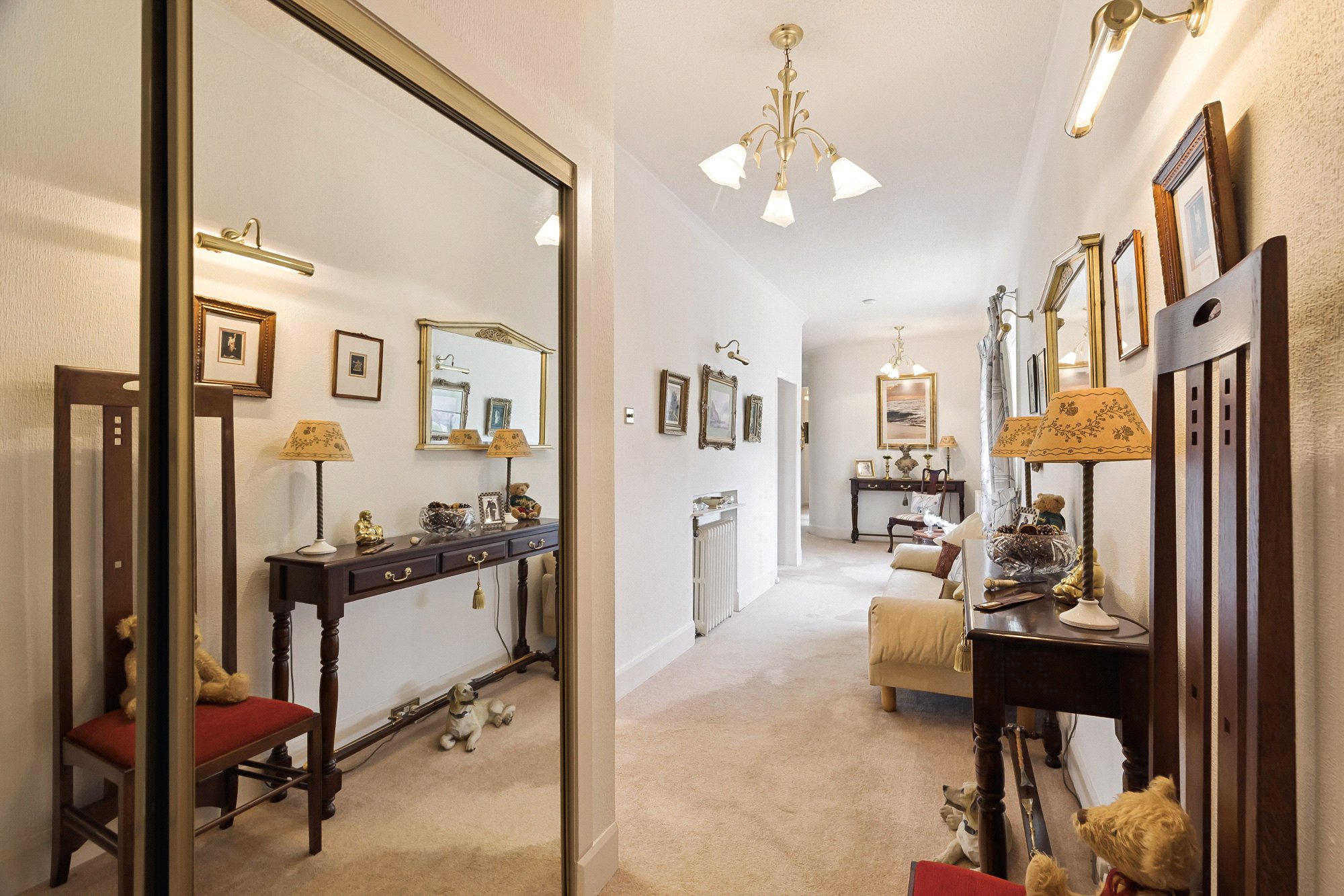 - Long winding reception hall with two storage cupboards off.