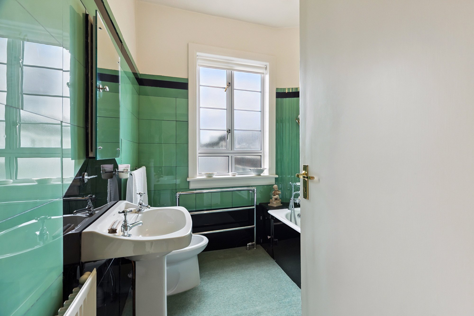 - Three piece bathroom with original emerald green tiled finish and window to the side.
