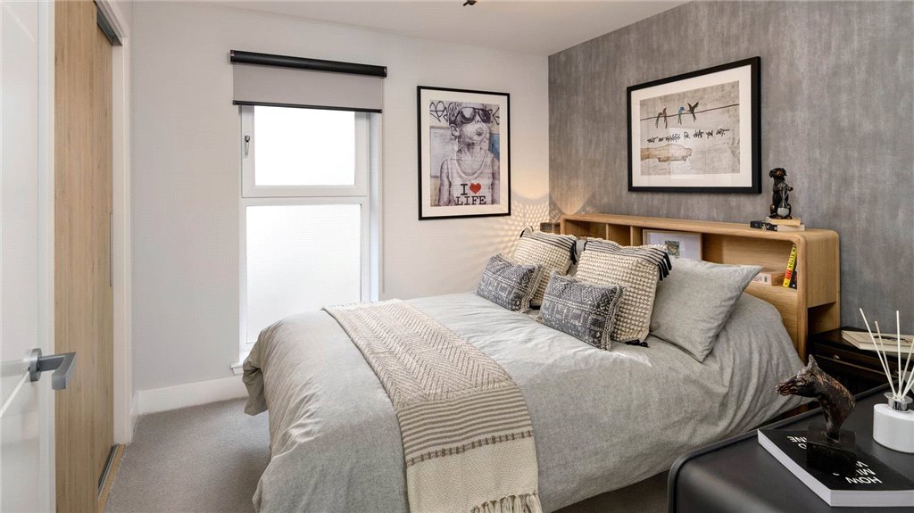 The L-shaped kitchen and dining area comes complete with fully integrated appliances and impressive fittings, perfect for entertaining friends and family. Both bedrooms benefit from stylish fitted wardrobes with sliding doors and shelves as well as contemporary vertical windows that ensure the bedrooms are bathed in natural light. Additional storage space can be found in the hallway.