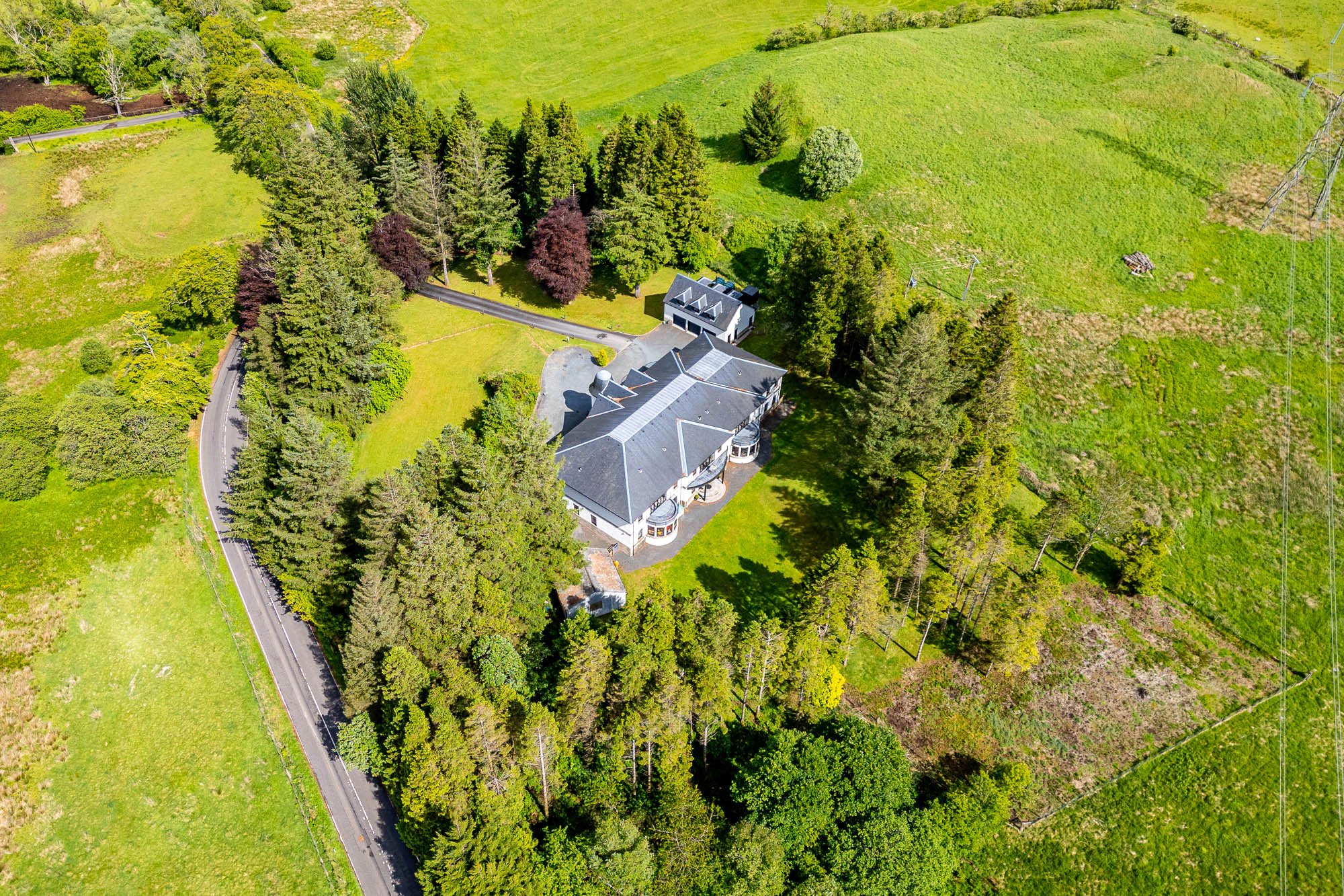 Mearnswood Manor is a magnificent modern detached home set within approximately 20 acres of private grounds. This luxurious home was built to a superb specification in 2011 and extends to approximately 10,500 square feet over three levels and provides both spacious and adaptable family accommodation. Majestically positioned along a quiet stretch of Mearns Road behind electric gates, at the end of a long flood-lit driveway, this is a rare opportunity to purchase one of the finest homes in Newton Mearns and we highly recommend early viewing.