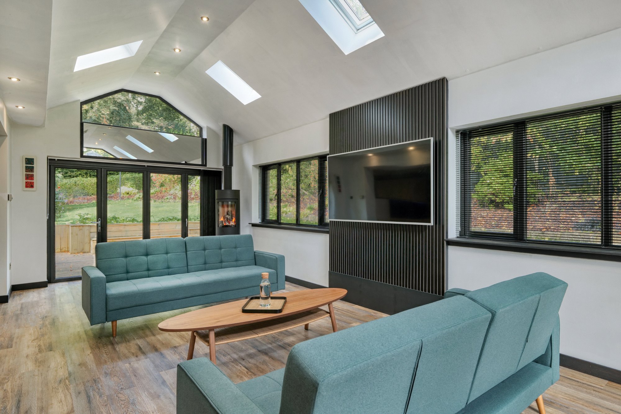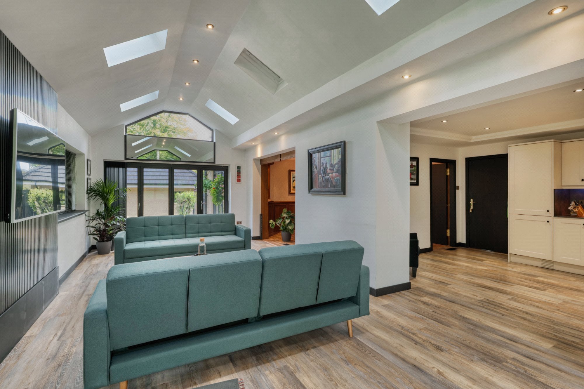 Ground floor: Large and welcoming reception hallway leading. Formal lounge with views to the front and rear of the property, feature fireplace, recycled wooden flooring from a ship and bi fold doors leading to the rear garden area. Dining room with stunning wooden panelling and built in drinks cabinet. The dining kitchen is fitted with a range of wall mounted and floor standing units, complementary worktop surfaces and integrated appliances. The kitchen and dining room are on an open plan arrangement the stunning orangery extension, providing natural light from the rear of the property and benefiting from twin sets of bi fold doors and is surely an incredible area from where to enjoy garden views throughout the full seasons, the log burner in particular will be enjoyed in the winter months for warm and cozy evenings in. A guest bedroom and separate shower room complete the lower level.